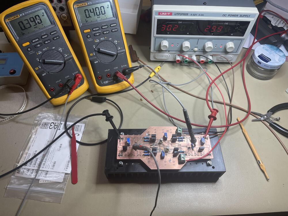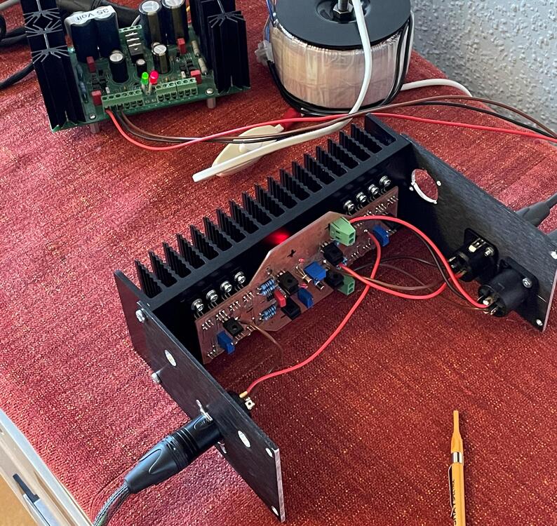 Here is picture of the amplifier in work. Mono version. AMB sigma 22 PSU. It has four trimmers. Lower middle controls the offset. Middle upper controls the balance. The two outer controls respectively channels bias. Input stage current source/sink approximately 1.7 mA. Output bias 35 mA. Setup procedure I used: • Let heats sink get warmed up to working temperature • Trim offset to zero • Trim balance to zero • Set desired bias of both channels to desired bias Redo previous procedures if needed. I find the setup easily done.1 point