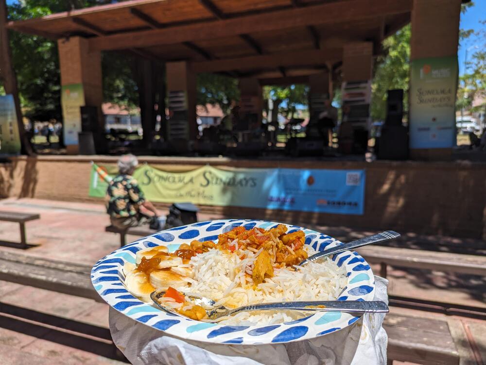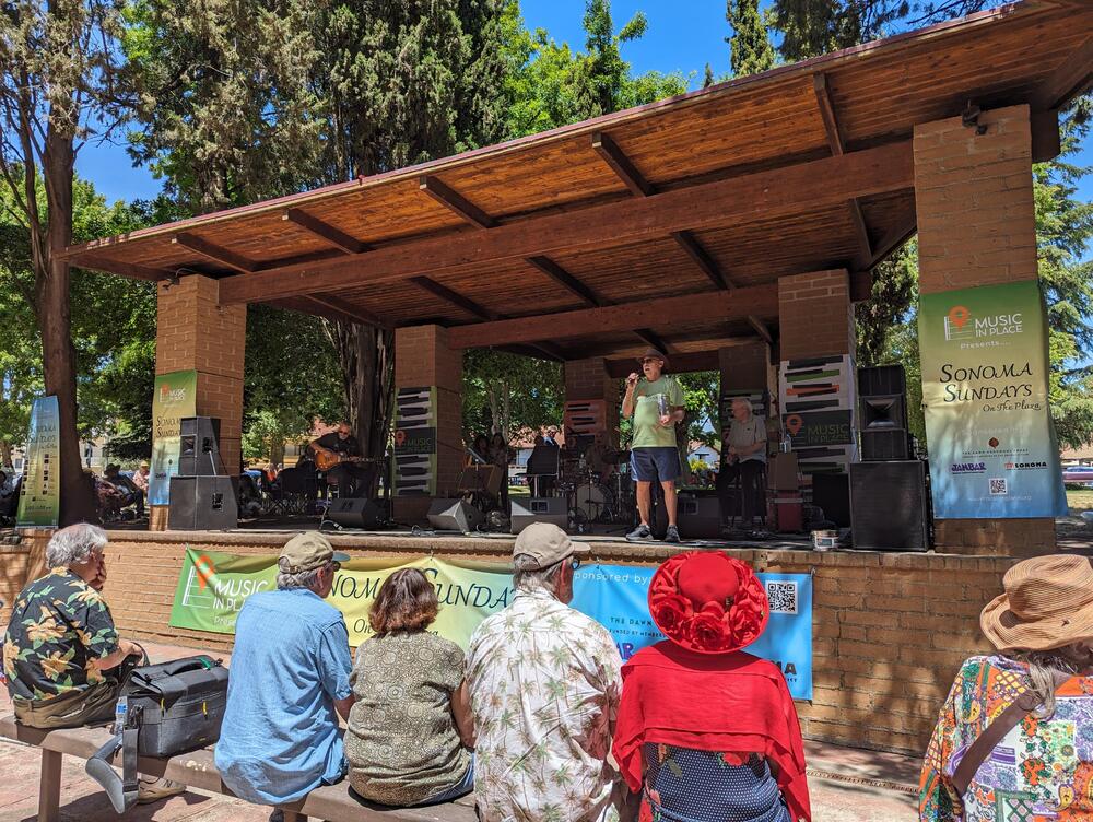 Hello Sonoma! Sonoma Sundays on the plaza With Maria Muldaur As an 81 year old lady, she can still sing the blues, but asks us to be present and put away our phones, cameras and video's and pay attention as "She's trying to work over here" . I can only respect her wishes. After a rockin' hour and a quarter set she's taking a well deserved break, before doing the same again. As I said to Joanne, this audience makes you feel young 😉 She has quite a repertoire of other people's songs, but she sang one of her few self penned numbers, from the pandemic. We should all be lucky enough to have so much life in us, at her age. Her red hot Louisiana blues band are not too shabby either.1 point
