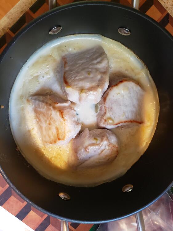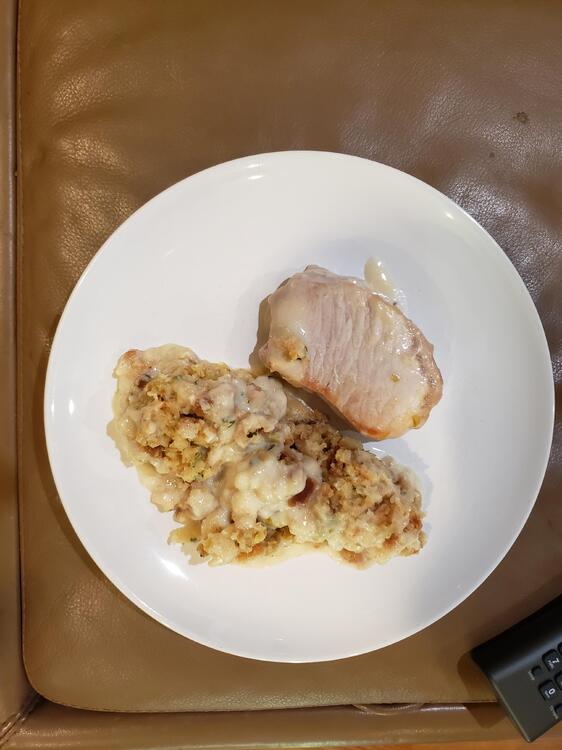 I'm cooking what I call Redneck Casserole. 1 box of Stovetop Stuffing, cooked as directed on box, then formed into a pyramid mound in a medium sized pot. Today I'm using pork chops, but chicken thighs also work well. I pre-fry the pork chops for a few minutes to get them browned on both sides, then place the four cops on the sides of the stuffing pyramid. Next open a can of cream of celery soup, mix in a bowl with equal parts milk. Pour soup/sauce all over the pork chops and stuffing and throw it in a preheated 350 degree oven for about 20 minutes, uncovered. Eat. I forgot to take prep pics, but will add finished pic when done.