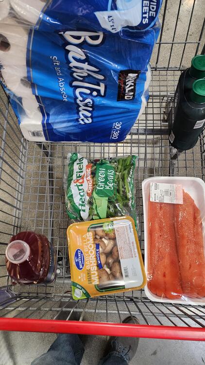 Not cooking until tomorrow, but gathered lunch ingredients for Al's Sister (Rini) and myself. Going to cook it on the Weber flattop. Skin down and squirt a little water under the steamer lid. Then sauté the green beans and mushrooms at a fairly high heat. Have a loaf of Kirkland rustic bread as well. Hopefully Al will cook up the unused portions Monday or Tuesday.