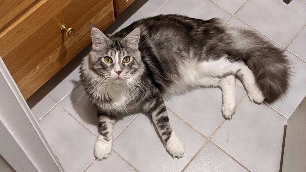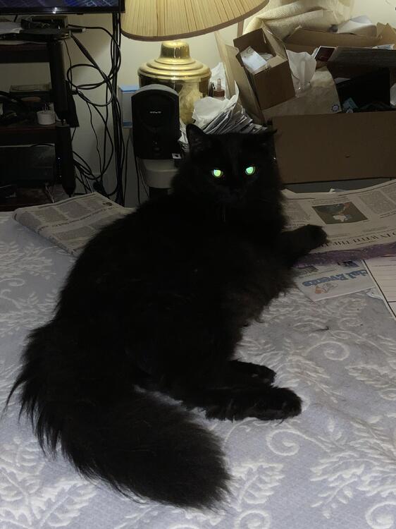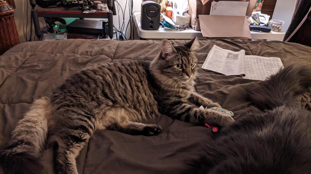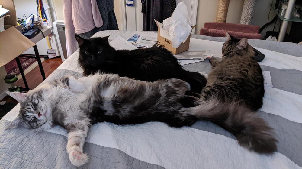 The current crew. Rufus (black)runs things. Hugo Z Hackenbush (Maine Coon) is the baby and gets into just about everything. Molly (brown tabby) stays out their way