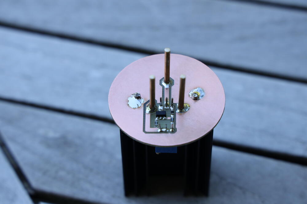 New solid state CCS for Megatron. Now with a third pin for ground. The pins are made from 2.5 mm brass rod, which is almost 0.10 mm thicker than tube pins. PCB is a CNC milled one side 1.5 mm copper clad. So, no copper on top side of PCB. Holes for the three pins are 1.0 mm deep and you have 0.5 mm epoxy laminates left. Transistor pins are protected with heat shrink tube and the exposed metal tab is protected with a 3D printed cover. The screw holding transistor to heat sink is electrical connected to it and to the ground pin. The white base with guide pin is made of three 3D printed parts. -