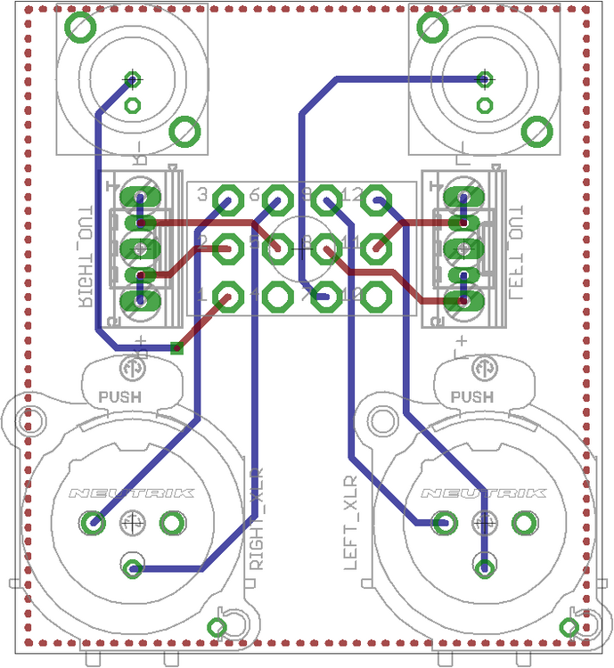 You mean the 3 parts (XLRs, RCAs and switch)? It seems to though I haven't measured or done any sort of mock up. I think there will probably be enough slop possible in assembly to get them to match, but I'll play around with it. The switch is an NKK m2042xxxxx, and the Neutriks are NC3FAV2. I tied the two chassis gnd connections from the Neutriks together with a pad in the middle, and did the same with the pin 1s. Then put two pads in connected to the board gnd plane. I'll probably add another pad for chassis ground to give the most flexibility. On my Pass Aleph P, the XLR grounds both go to board ground. Same on Kerry's SS Mini. I haven't had any hum problems whatsoever on my stuff, but everyone has different issues potentially. Thanks for getting me thinking about this shit though I also used a drawing of the Cardas GRFA DBL PRT that someone had provided on a diya thread you were participating in to draw up that part in Eagle as well, in case I wanted to go that route.