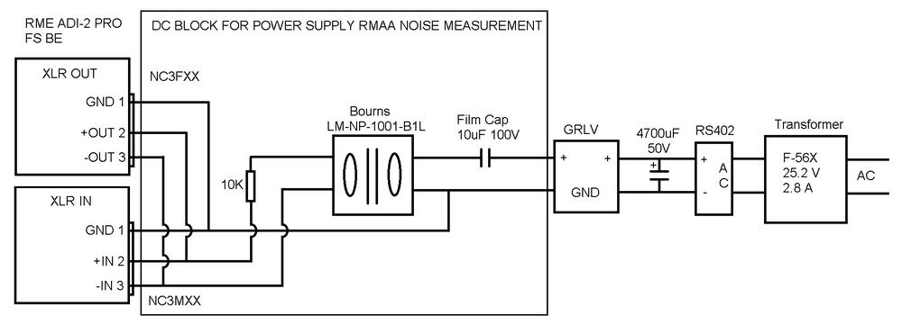 22. I've been able to use my RME ADI-2 PRO & RMAA 6.4.5 to measure GRLV power supply output noise. Kevin asked about using my setup with a DC block. It started with a 10uf film cap and 10k resistor then an audio transformer to isolate the RME from the power supply. I discovered a few sources of noise and removed them to get the GRLV output noise down to -120 dB. The first source of noise was 50 Hz and it's harmonics from 7 LED volt meter displays. The second was from not having ground connected from the RME to the power supply. The third was 60 Hz and it's harmonics because the GRLV circuit was too close to the power transformers. 1" was too close and 4" was much better. The pics in the previous post shows the progress over the last 10 days. The final 2 pics show the positive and negative voltage outputs on left and right channels. Then the final pic shows before and after the GRLV circuit. Here is the DC block circuit used to measure the output noise. I used one for each channel.