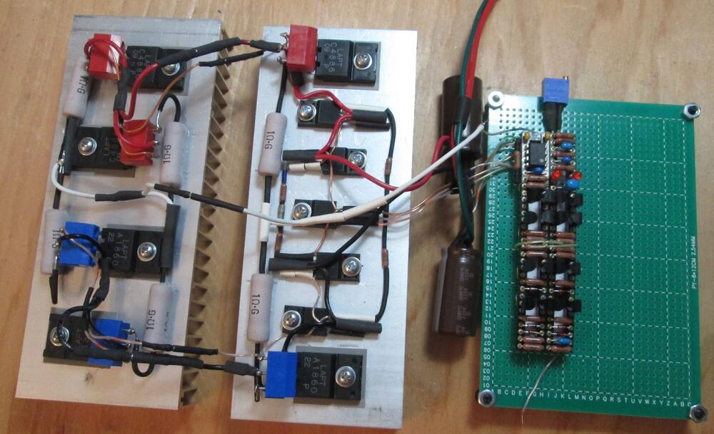 9. Here is my new CFA2 LargeT version up and running with large triple output transistors pairs it first started up at 200ma bias and turned it down to 150ma offset is less than 1mv with the servo The big resistors are 1 ohm 5 watt 2% Metal Oxide Film MOSX5C1R0G the other resistors are RN55 & CMF55 the caps are 560pf 100v FG28C0G2A561JNT0 47uf 25v FG26X5R1E476MRT0