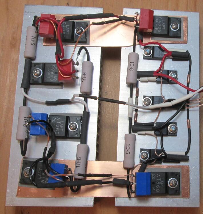 8. I noticed that 1 of the 3 bias was lower than the other 2 after warming up. Had to add a couple of 20 gauge copper strips to thermally connect the 2 heat sinks together.