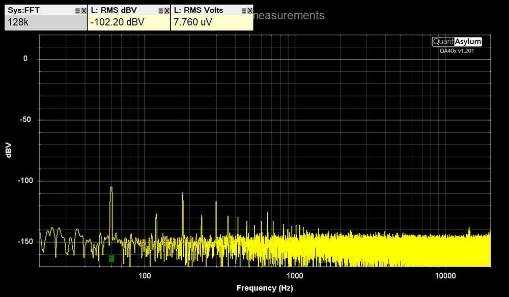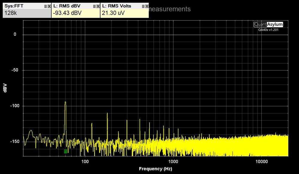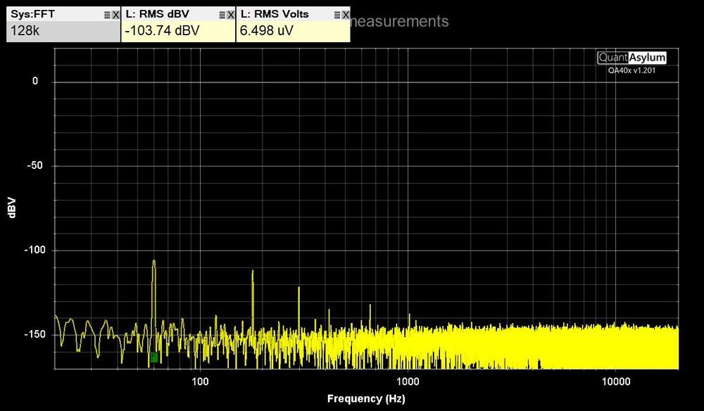 5. QuantAsylum QA403 tests Tested my GRLV noise level with the QA403 by connecting it directly with BNC test leads. The maximum DC input of the QA403 is 40 VDC. Measured the positive and negative voltages separately to see each noise level. Used the left positive input BNC and put a terminator on the negative input BNC. Installed software from https://github.com/QuantAsylum/QA40x/releases/download/1.201/setup_QA40x_1.201.exe Start app and Select File-> Devices-> QA403 Select File-> New Settings, Set the FFT size to 128k, the full scale input to 0 dBV, and hit Run. The first image is with the 36" BNC test leads alligator clips shorted together. The second image is the QA403 connected to the GRLV with no load. The third image is the GRLV with CFA2 as the load. Have less than 8 uV RMS Volts on each output. Was able to run RMAA on the QA403 by installing ASIO drivers. https://github.com/dechamps/ASIO401 Install https://github.com/dechamps/ASIO401/releases/download/asio401-2.0/ASIO401-2.0.exe Have to adjust the input/output scaling with the configuration file ASIO401.toml in the Windows user profile folder; for example: C:\Users\Your Name\ASIO401.toml Make sure the file doesn't have .txt on the end of it. My settings for the RMAA loopback cable tests are: fullScaleInputLevelDBV = +6.0 fullScaleOutputLevelDBV = -2.0 Adjust levels when testing an amplifier with gain. The input values can be: 0.0, +6.0, +12.0, +18.0, +24.0, +30.0, +36.0 and +42.0 The output values can be: -12.0, -2.0, +8.0 and +18.0 Install RMAA https://audio.rightmark.org/downloads/rmaa6.exe Right click and Run as administrator. Start it and select ASIO401 for input and output device. Select 24 bit and 48 kHz. ‌Install four coax bnc loopback cables from output to input on the QA403. select Playback/Recording icon. start test if signal levels are good, otherwise adjust levels in ASIO configuration file. when test is done, save to location. Generate a RMAA test report with the paperclip icon. The test report has misspelled configuration signal as singal. I used hexinator app to edit the rmaa6 executable C:\Program Files (x86)\Rightmark\rmaa6 Select Edit, Find, singal at 496C00 Change the hex code 6E 67 to 67 6E and save. Here are the results of the RMAA balanced loopback tests in the last image. A picture of the QA493, GRLV, CFA2 is the fourth picture. The GRLV has the transformers in the rear box and the regulators in the front box. Two steel panels separate them to lower noise.