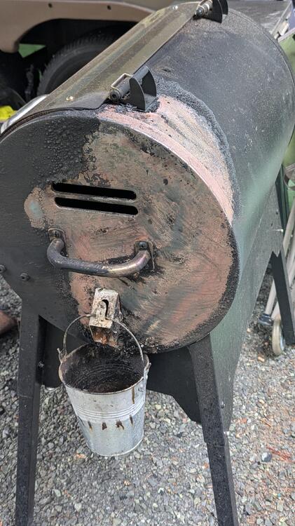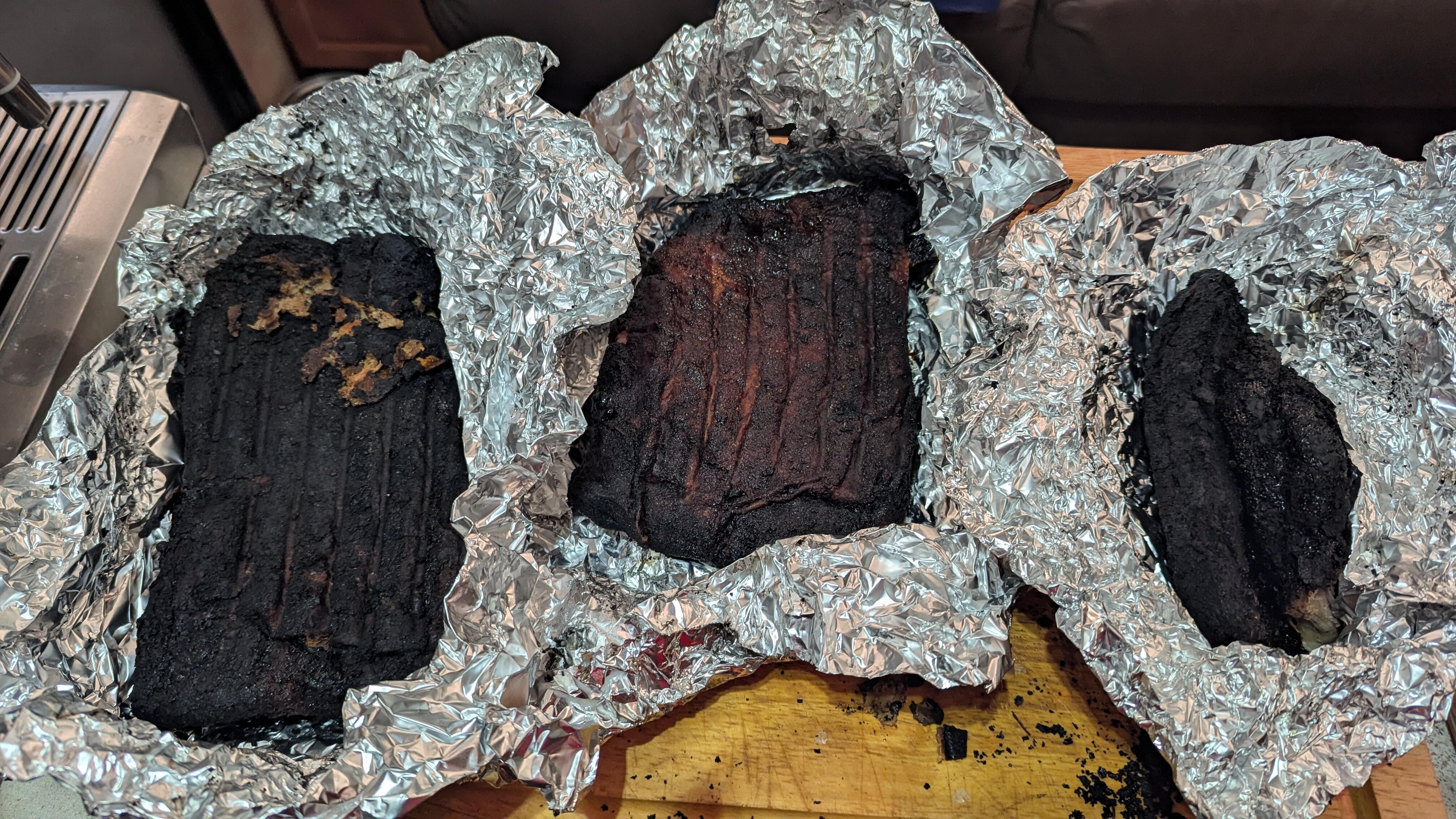 So I wanted some new year pork belly... Loaded up the grilla with three chunks. At about 9pm last night they were hovering around 180 degrees. I was going to give it another hour and give it a check. Well I had walked out to a grease fire happening. Pulled the pork (what was left of it) and put out the small fire. Some cosmetic damage: and three pork briquettes. The middle one might have some salvable pork on the inside. I will deal with that later. I need to clean everything up because I have a slab of salmon to smoke up. Happy New Year! 🥳
