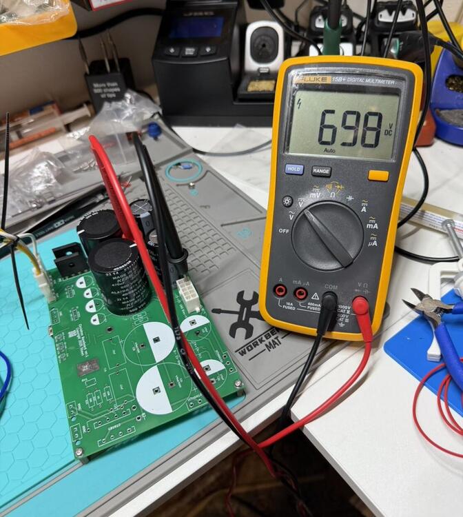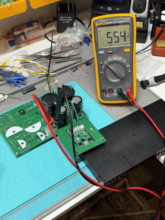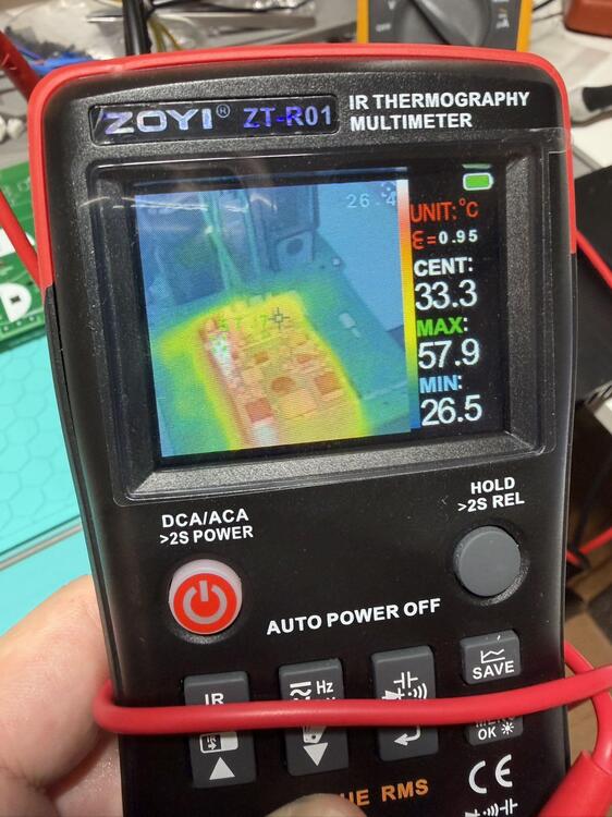 OK. Did a first power-up test for CRHV today. With 360k set for 550 V, I’m measuring about 554 V in practice. I only let it run for ~10 minutes. A quick IR check shows the CRHV peak temperature at ~58 °C. I suspect running it from dual 250 VAC inputs targeting ~600 V output may result in slightly better thermal behavior. At the moment, only the high-voltage section is populated. The delay soft-start and ±15 V sections are not installed yet, but they should function as expected once added.