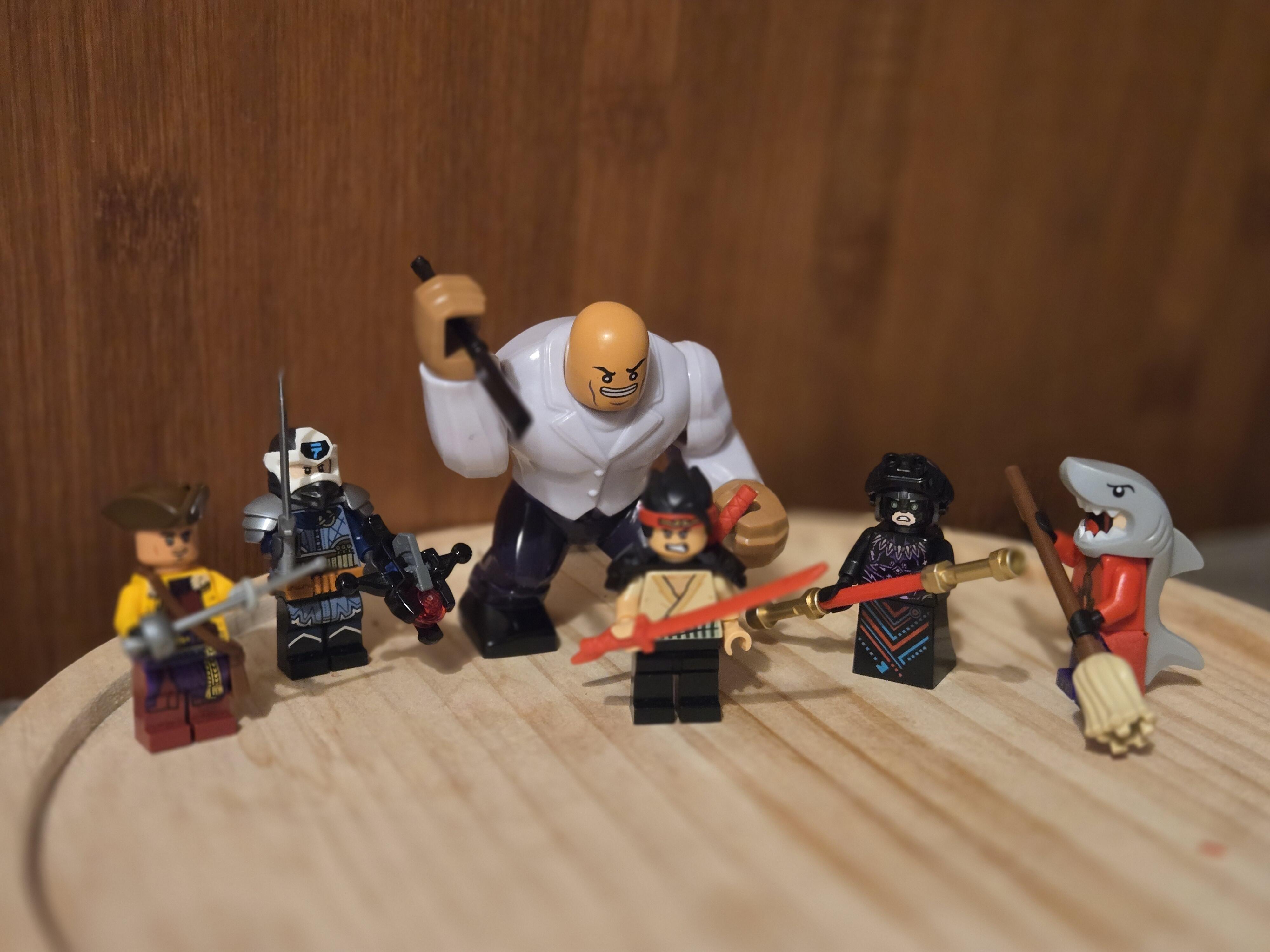 2. Helmsman/Navigator, Master Gunner/Quartermaster, Cook/Surgeon, Shipwright/Powder Monkey, Boatswain/Mystic... Captain/Master-at-arms in the front The Shipwright/Powder Monkey is the Tinkerer (reskinned Wizard) and will have an actual Monkey familiar that will be trained to assist the Gunner with the cannons. It's a little blurry, but the swashbuckler with the Rapier has a hooked hand, which I love. The fishman karate master will use natural weapons or improvised weapons like mops, oars, etc. I'm having way too much fun with this, lol.