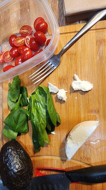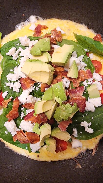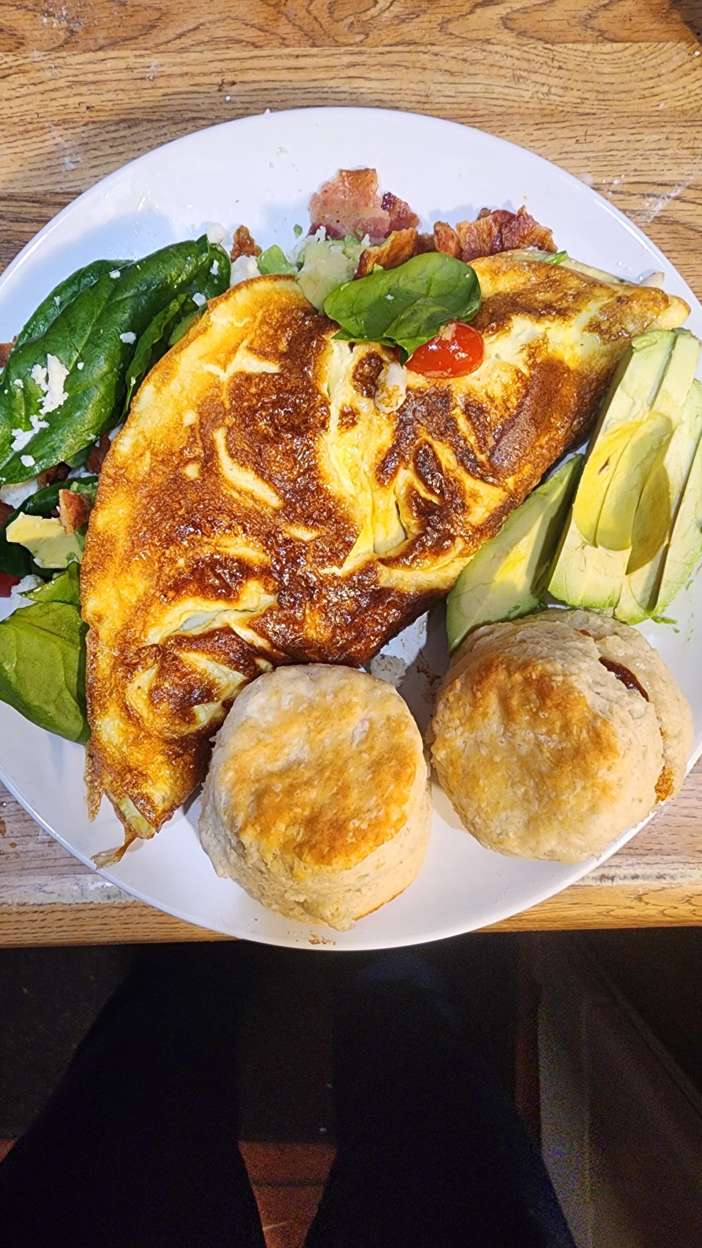 Bacon, tomato, spinach, avocado and queso fresco omelet with fresh baked biscuits. I think I've mentioned before that I like my omelets on the darker side. Iced coffee with Irish Cream Liqueur to drink. Food coma incoming.