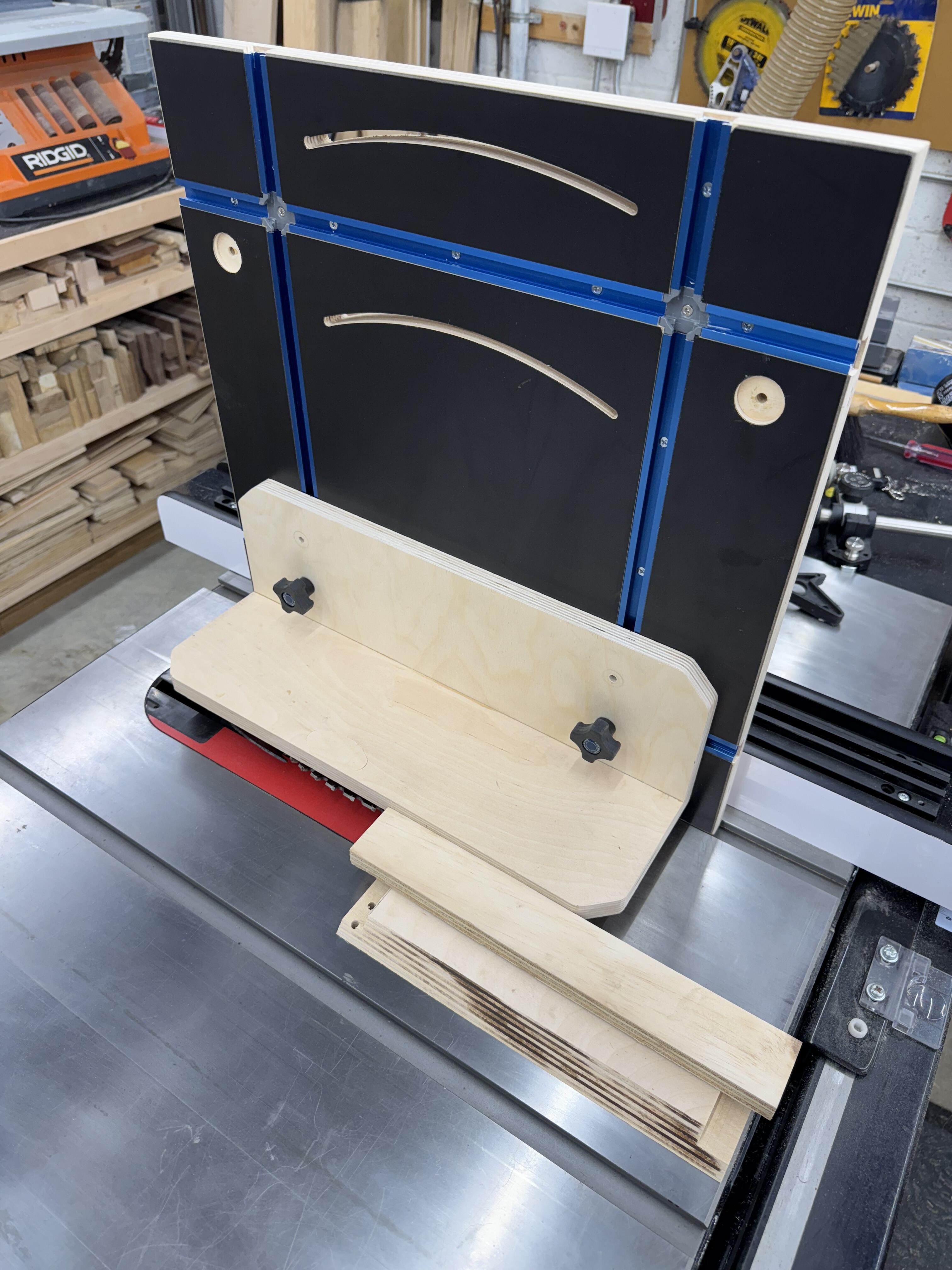 I'm not sure anyone cares, but here are even more pictures of the jig demonstrating the various uses. Tenon, mortise, bridle joint, etc. Splining miter joints L-fence for ripping straight edges or long miters And a gratuitous shot of Steve on Grindr