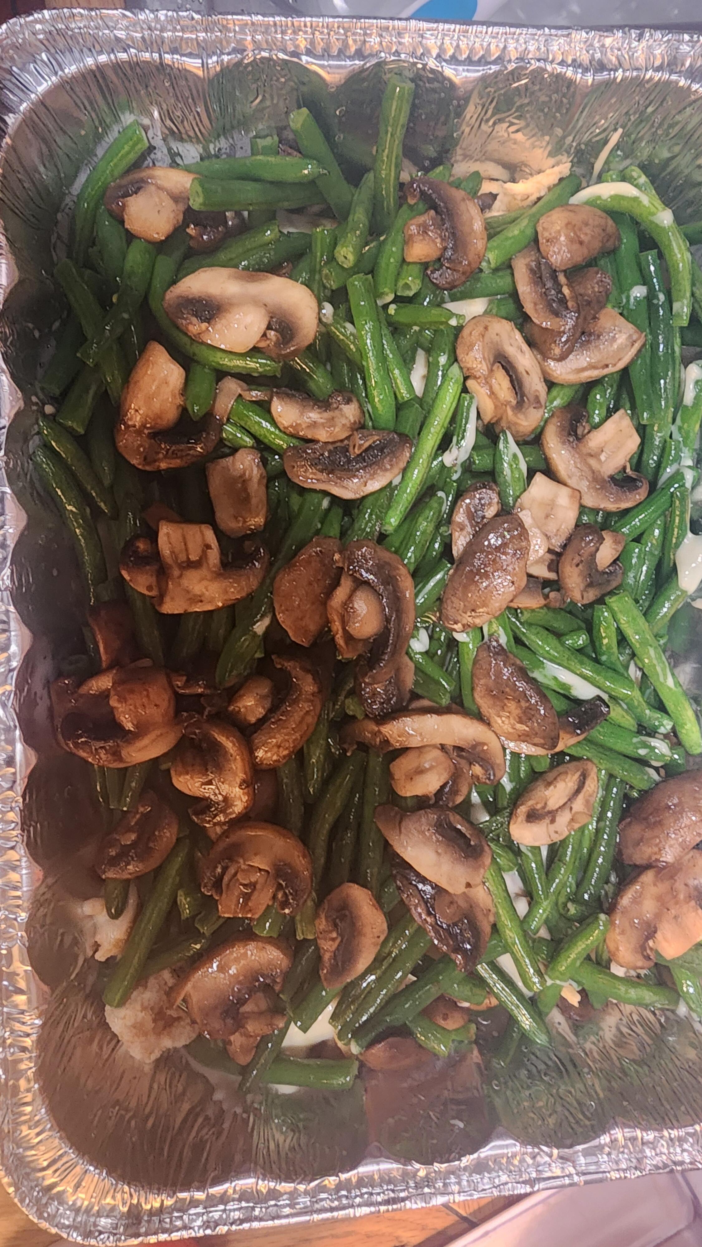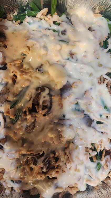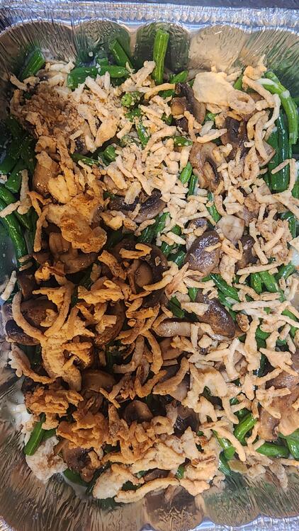 When I was a kid my Mom made the same Thanksgiving dishes every year. One of them was green bean casserole. Probably like many of your Moms made too. I didn't hate it, but I didn't love it either. Canned green beans, French's fried onions and cream of mushroom soup. Like many vegetables and other dishes of my childhood I didn't know that I liked them until I was living on my own and tasted the fresh version. So I thought the concept (Trump joke) of green bean casserole was good. But what if it was elevated to using fresh ingredients? So today I set out to test that theory. I trimmed and sautéed about 3 pounds of green beans. Then sliced and sautéed a large amount of mushrooms in butter and white wine. I decided that making my own fried onions might not be worth the extra effort, so French's fried onions it was. In place of cream of mushroom soup, I used cream of celery soup, as I like the flavor better and had already incorporated fresh mushrooms into the dish. I have enough for a small army, as I had planned to take this to Al's before catching a cold. How is it? Well it has about 15 more minutes to bake, so I'll let you know later. You can't tell, but there are two layers of everything in the dish.