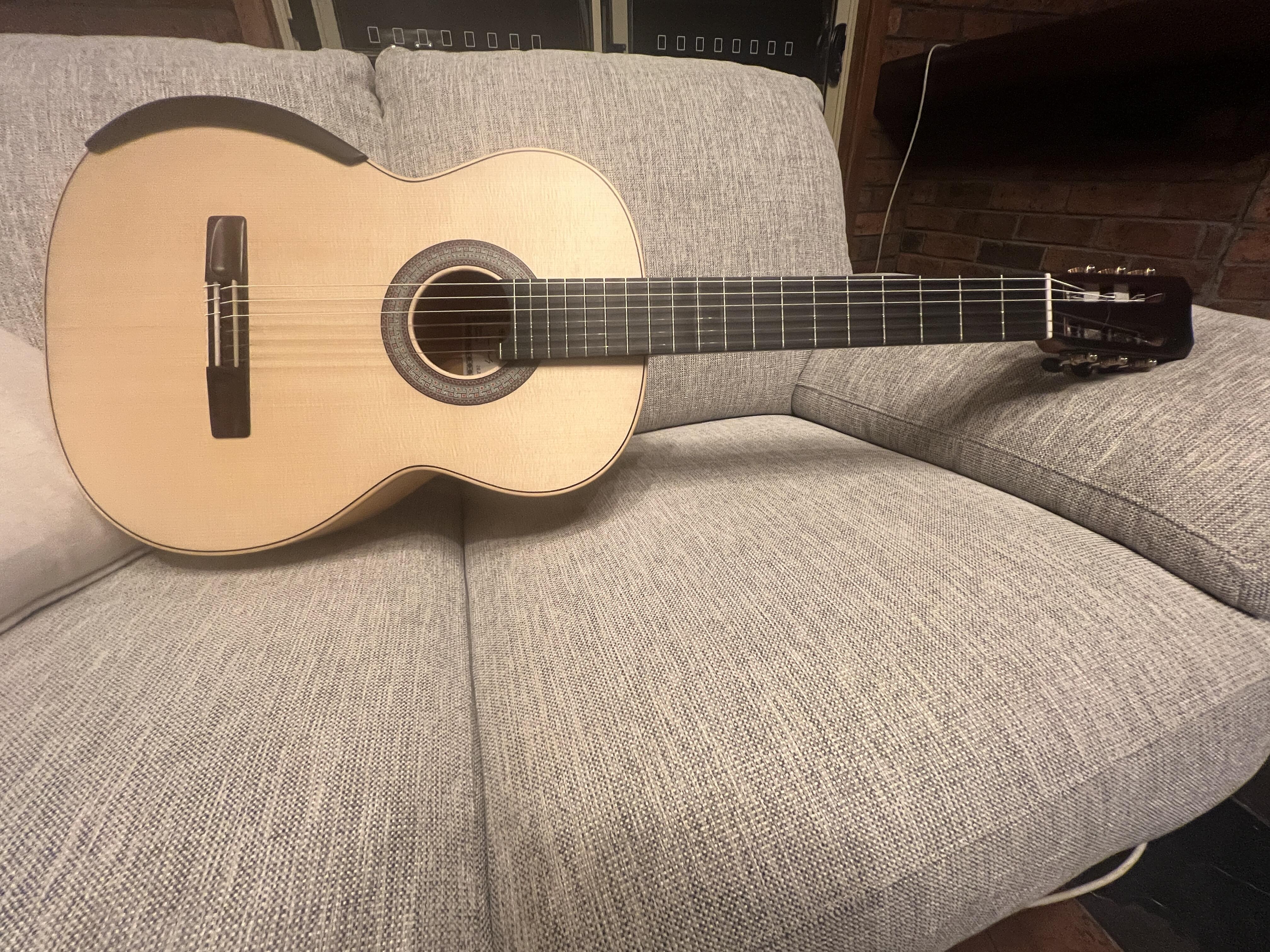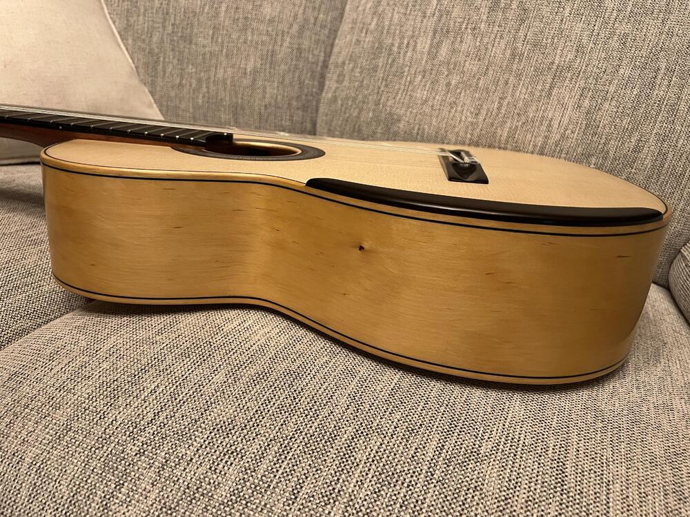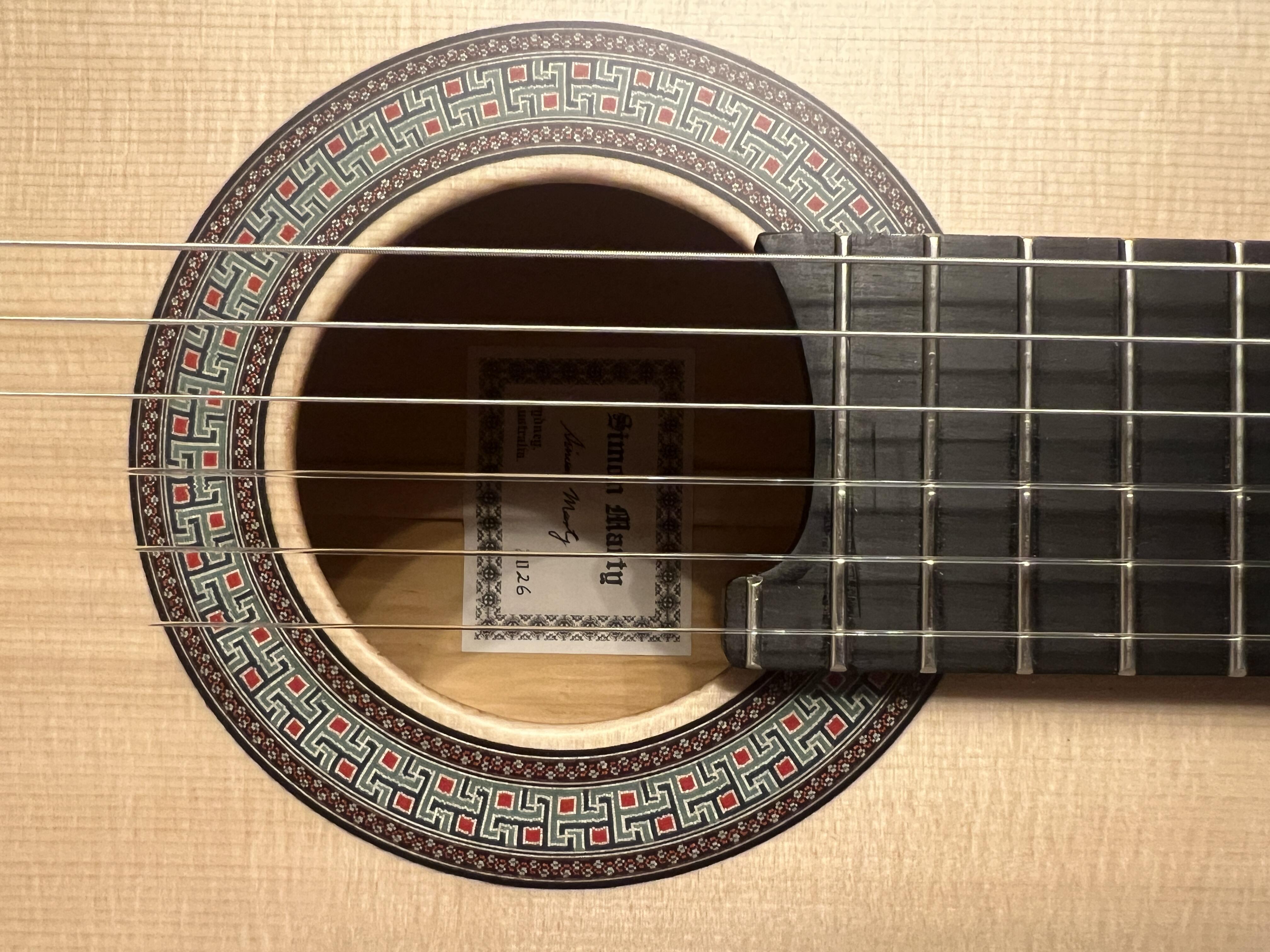 This is my latest to add to the growing collection, I think a may have a problem... oh well. This is a Simon Marty guitar, it features his innovative radial bracing, the back and sides are ancient Huon pine, salvaged before a dam flooded a valley, estimated between 1000 -1500 years old, the neck is Australian rosewood and the top is spruce.