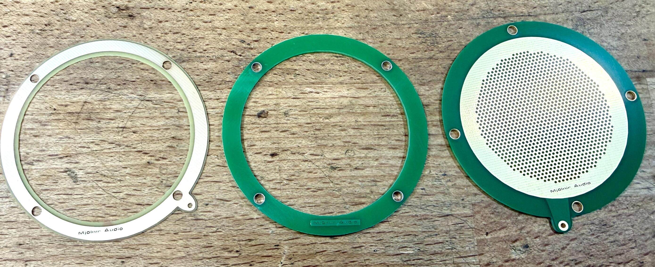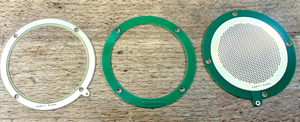 Finally the PCB's arrived for the Kiwi Ears headphone drivers: Just three different PCB's needed, on the left is the diaphragm ring which is a 0.6mm pcb but with no solder mask so it is actually 0.51mm. This has to be ENIG to make it completely flat but most fabs require that anyway. Film is 2um mylar-c as that is so simple to get and relatively easy to work with. In the middle is the dust cover holder/spacer. I made this 1.6mm thick as that way it clears the stock lip on the baffle that was around the dynamic driver. I used the first one as spacer and then stacked up the driver sandwich. For the dust covers I used the same mylar as the diaphragms but not stretched as much Finally the stators, 1mm ENIG pcb's and this is the outer side with the inner side having a smaller active area, aka like the SR-007. Holes are a bit less than 1mm but that can easily be altered for another run. Here they are assembled with the only alterations to the baffle where I counter sunk the mounting screws. There were just the three holes there in a row and with the earpad mounting plate being flush to this, it had to be done. One second with a counter sunk bit will do this as this is nasty, cheap ABS plastic. Here they are assembled. Only mods to the chassis is that I enlarged the two holes there are on each side (cable entry and a port on top) to 5mm so the strain relief would fit and the solid plastic plug I glued into where the port is. The cable is the 6 core silicone wire that can be found everywhere now with a 3D printed Y-split and Stax plug made from an XLR plug and pins. Now for the sound... lets just call it work in progress. This is very much the first draft and one channel is slightly weaker than the other (I swapped out the diaphragm for another which fixed it mostly) so I need to look into that. I'll probably just build a second pair of drivers so I can match them into pairs as I have another set of the headphones. Massive baffle leak too and the housing... has issues... so bass is not their strong suit for now. That needs to be fixed but I might have to get creative with that. Still for a cheap project that took only a few hours to make and cost less than 150$ all in... there are worse ways to spend an afternoon.