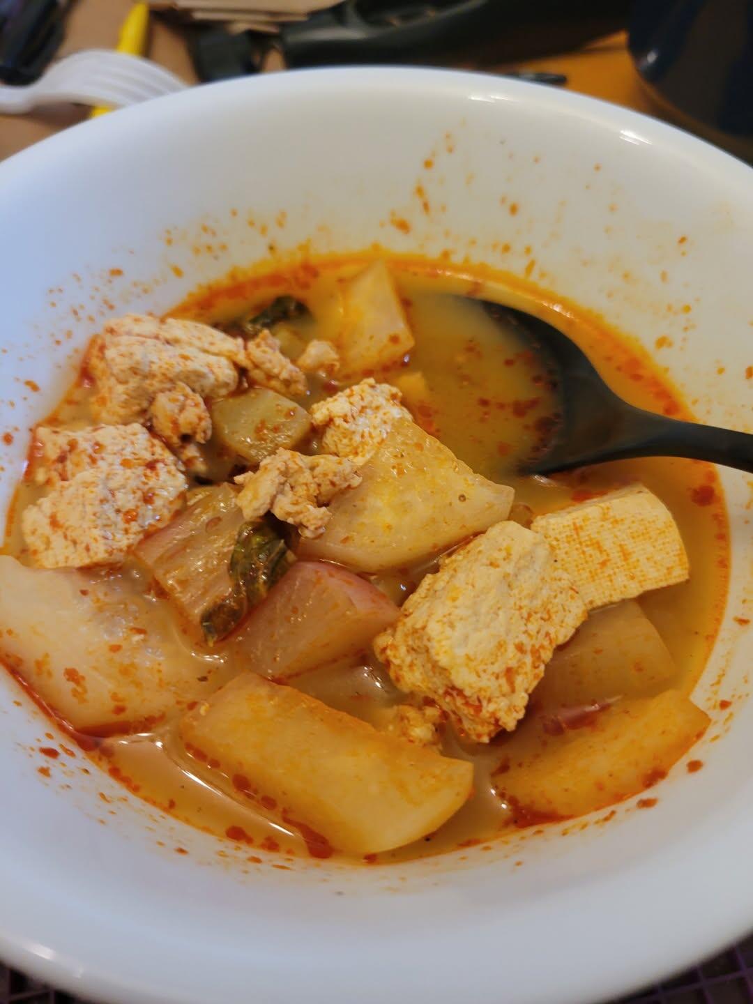 hot pot soup with tofu, daikon radish, regular(?) radish, bok choy, bell pepper guts...and a wee bit of chicken