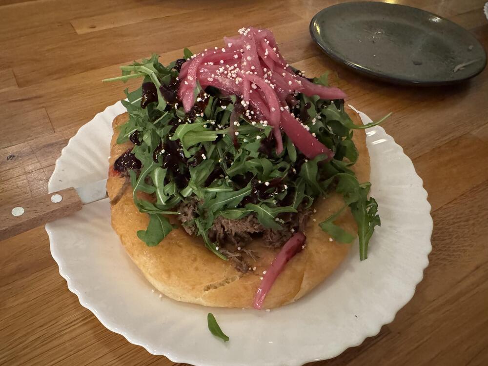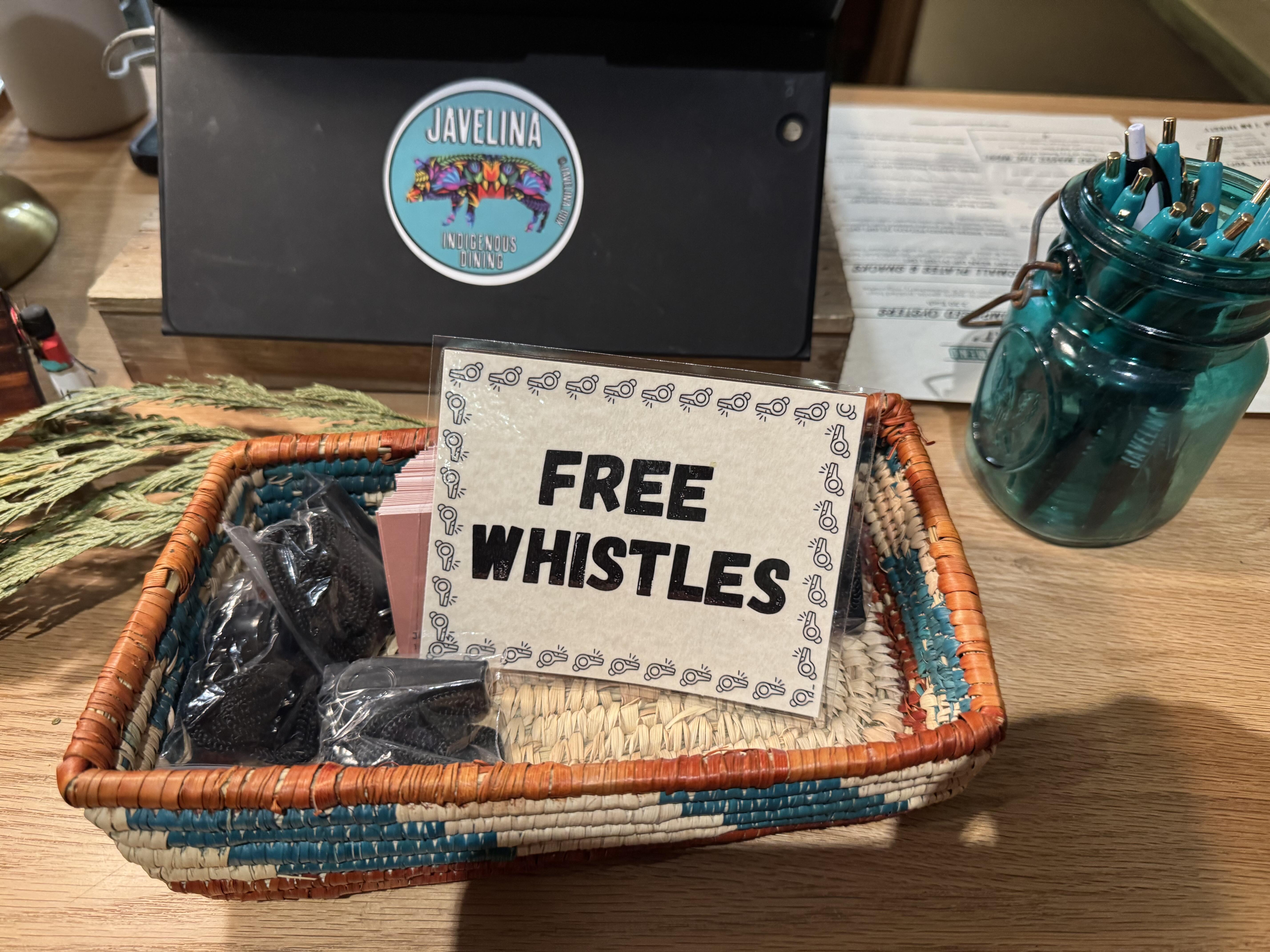 2. Dinner tonight was at Javalina Indigenous Dining at it was excellent. We had a variety of dishes but the only one I snapped was the elk fry bread with a significant pile of pulled elk, arugula and pickled onions on fry bread. Delicious. At the front counter, there was a basket of whistles for anti-ICE protests and support of the targets of this fascist aggression.