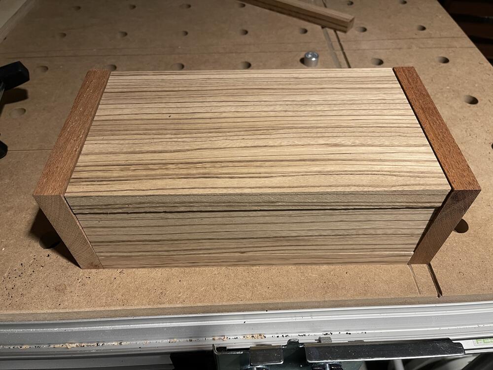 Test fit of the bedside hardwood box for Kasia. Still need to sand, chisel for the hinges and route out some edges on the outer mahogany pieces and a finger groove on the lid and then nail it together and then seal. Birthday is tomorrow, so I am glad I got her other gifts also as this one is going to be late. just stacked up in the picture the lid and front panel will match up when I actually nail it all together.8 points