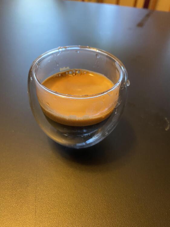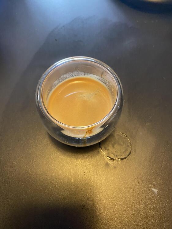 I finally opened my Levercraft Panamanian Gesha. 16.5 in, 40 out in 48 seconds (longer pulls are normal for manual machines, and that includes pre infusion:I used the Flair Pro2 head). I flow controlled: pre-infusion, ramp to 3 for 10 seconds, fast ramp up to 7, then a slow decrease to finish. I find that works well for light roasts. The OG gave me as fluffy a grind as you could want. This coffee was roasted 9/21. I have never had Gesha before. I dunno if it was the beans or the fact that I’m really getting good with the Flair, but it was absurdly delicious, if you like very light roasts. I’ll be thinking of this shot for a while. And it was pretty. Not quite fine enough for stripes. Puck was slightly wet on top but knocked clean in one piece. The damp puck heads seem to be normal with the Pro2 brewhead. The “classic Flair” brewheads are usually as dry as you could want, but don’t make as good of coffee. I’ll be thinking about this espresso shot for a while.1 point