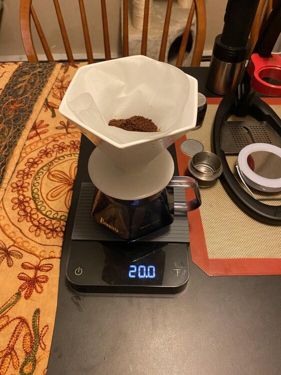 Too many variables to really know what is what: first pour over of this bean. First use of the new dripper. First use of the new kettle in a pour over. First use of the new filters (CAFEC), first use of the new server. Slightly too fine (I forgot to recenter the fine adjustment on the OG when I went back to pour over: it worked out): it stalled out at the end. 1:15 with a 20 gram dose. Flavor profile is right in line with the espresso I made from this Gesha. Bright, floral, deep, rich. Delicate but sort of silly. This was a delicious cup of coffee. And talk about zero retention. 20 in, 20 out.1 point