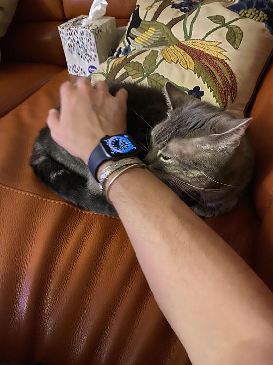 I don’t spend a lot of time not moving. I only get on the sofa, really, when my partner is in town. She’s asleep at the moment. Dunhill is taking every second of couch time he can. Other cat is on the other side, but not quite close enough to me to not be “not in contact.”* *time not quite right between the pics because I had to let Silver settle in.3 points