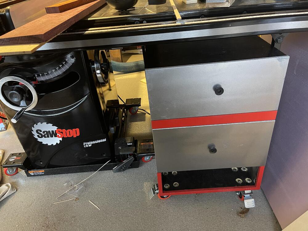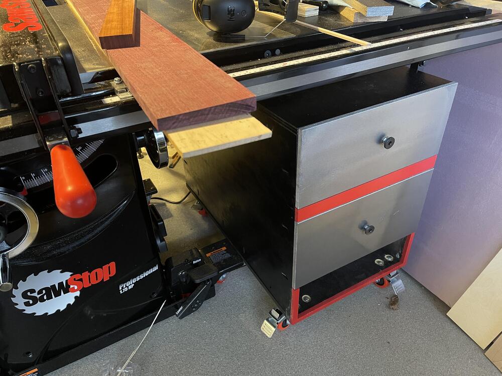 Spent most of the day going through scraps trying to find something flat enough to make into a cutting board. Ended up with a Wenge/Teak plan but not sure if I need something brighter in there for pop. Also gave up on the cast iron looking paint technique and put together the cabinet under the saw. Need to buff out the wax but as about as close to cast iron as I could figure out. The leveling feet ended up being boring so when I have access to a welder in Texas I am going to weld some bolts onto some blade wrenches and throw those on there.1 point