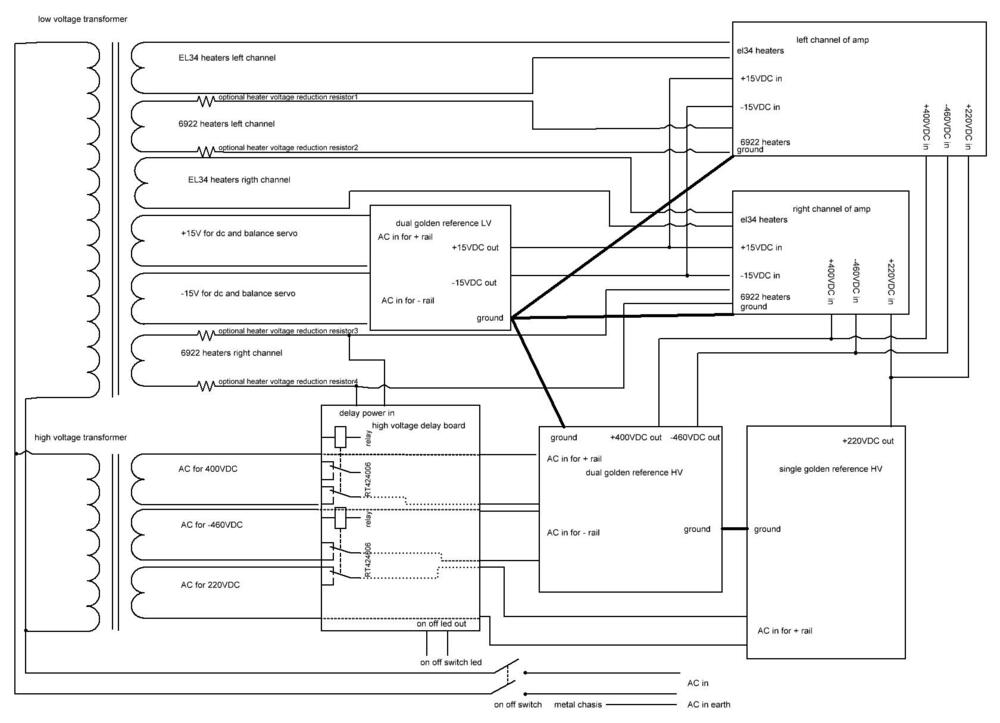 I run the heaters at about 6VAC which can increase the life of the valves. I have resistors on the 6922 heater transformer outputs because the transformers where outputting about 6.6VAC which is too much. (You need separate transformer windings for the 6.3VAC heaters on the el34s in each channel and separate from the 6922s heaters. The el34s have their heaters at about at about -400V.) The EL34s draw far more current and the voltages without any dropper resistors are about 6VAC for the transformers I purchased. On switch on all valves are provided with heater voltages simultaneously from the low voltage transformer and the opamp dc balance and dc offset servos are powered on from the +-15V golden reference lv or simple lv in the golden reference hv board. Only the high voltages are delayed in order to allow the valves cathodes to heat up and develop a space charge before the high voltages are activated. I use a one minute delay. All other voltages pass through the delay board without being switched or delayed. Here is a simplified block diagram for the wiring I used (there are other ways of doing this).0 points