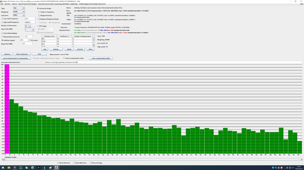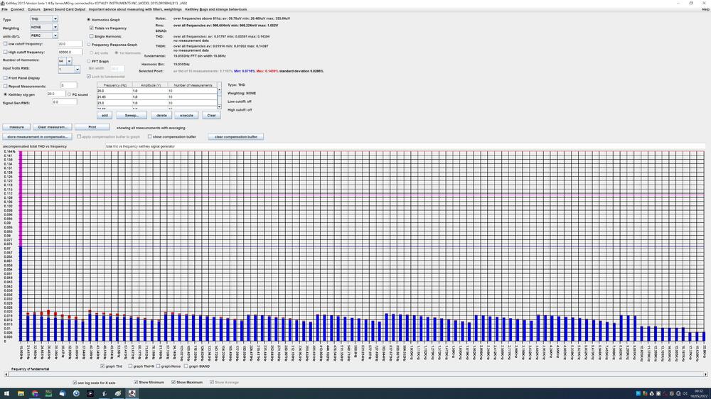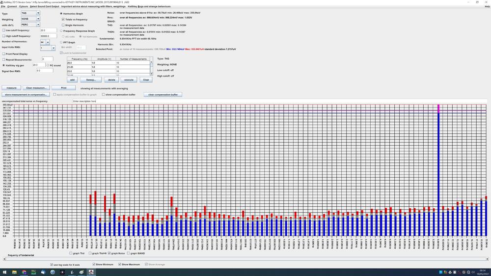 This is a very niche topic so if you are not planning to buy or write programs for the Keithley 2015 or 2016 thd or p multi-meters then this post will probably not be interesting to you - especially given their skyrocketing prices on ebay and their age. If you are planning to buy one because it has audio analysis built in then there are a number of limitations and issues you should be aware of before deciding to buy. Some of these limitations effect the accuracy and validity of its calculations and are not documented in the manual, some of the limitations effect usability and some effect it programmatically if you access it through gpib or rs232. If you look on the internet there is very little software written for these meters and you may be wondering why. Well now I have written some software for them I think I have a better idea... Here is an example of the "quality" of the manual "The Model 2015/2015-P/2016 can use up to the 64th harmonic of a signal (64 times the fundamental frequency) in the THD measurement, but only recognizes frequencies below 50kHz. Harmonics with frequencies above 50kHz are ignored, therefore acting as an adjustable lowpass filter." What do you mean by use? are the ignored harmonics included in the background noise measurement? or are they simply ignored completely? Well it turns out thd+n included the harmonics as does SINAD. ( I'm still trying to determine for background noise since my calculations do not match the Keithleys). Similarly the statement about the upper frequency is ambiguous for multiple reasons. Bellow 50khz is included and above 50khz is ignored... what about exactly 50khz? more importantly what about a harmonic bin that starts before 50khz but ends after 50khz? or has its centre frequency at 50khz? The 50Khz limit is NOT adjustable and is absolute. There is a separate low pass filter which is configurable and can be switched on and off. Once you dig into the detail the descriptions in the manual leave more questions unanswered than answered. Limitations the in built signal generator goes from 10hz to 20khz only and is flat to within only 0.02db it also has a noise spike at 10khz average noise is about 50uV noise spike is more than 350uV.... thd measurement is limited to a maximum of 64 harmonics. This means if you are measuring the thd a 20hz input, the bandwidth of the thd measurement tops out at 20hz*64 harmonics i.e. way bellow 5khz.. However, Sinad and thd+n not limited to 64 harmonics.... this is obviously inconsistent behaviour and if the harmonics higher than the 64th are large in magnitude then the thd will be underestimated but the sinad and thd+n will be good... it is possible to limit the number of harmonics calculated in the thd to less than 64 using the front panel or programmatically but this does not effect sinad or thd+n calculations. But if you do limit the harmonics and then programmatically ask for all the harmonics any above the limit are not returned - they are lost forever. thd cannot be measured for inputs bellow 20hz or above 20khz all audio analysis is bandwidth limited to 50khz or lower (in some cases the bandwidth limit is 20khz due to the limited number of fft bins) and it is not possible to get the actual bandwidth limit via the front panel or programmatically. If you want to know the upper limit you have to reverse engineer its behaviour - the behaviour is not documented. The fft and harmonics are bandwidth limited to 50khz so if you measure a 20khz fundamental thd is calculated on two harmonics only and one of them is the fundamental! the fft bin width automatically varies depending upon the input signal fundamental frequency for example at 20hz the bin width is 20hz at 1Khz the bin width is 66.6 recurring hz this is not documented and must be reverse engineered to workout the relationship between fundamental frequency and bin width. This is made more difficult when: it is NOT possible to get the bin width displayed on the screen of the keithley or get the bin width programmatically. it is not possible to get the starting or ending frequency of a bin it is not possible to get the number of fft bins used in the thd, thd+n, sinad or noise calculations it is totally unclear from the manual if the rms value for the signal returned in audio analysis mode is the rms value of the entire signal, the signal plus harmonics or just the first harmonic. The manual simply says the result will be different from measuring the ac volts value of the input... Extensive experiments seem to indicate it is the rms of the 1st harmonic. The slowest part of a program communicating with the Keithley is transferring the fft bins especially using rs232. But the keithley does not provide a way for you to obtain the number of fft bins which contain valid data so you have to get all the bins. This increases an fft transfer time by up to 25% (in the case where bandwidth limits the number of valid bins) compared to only fetching the bins with valid data and the situation is far worse if weightings or low and high cut filters are used. you can improve performance across the gpib bus by setting the keithley to transfer floating point numbers rather than number in their text representation however not all measurement returns actually support this so you have special cases all over your program to determine if it should be reading a float or the ascii representation of a float. The manual is also not accurate ascii rather than a float is returned in float mode. If you apply a weighting filter such as C-message which only has a bandwidth from 60hz to 5khz the keithley does not reduce the fft bin width to provide higher FFT resolution. As a result, a 1khz input FFT with C-message results in only 300 valid bins out of 1023 and uses a bin width of 66.66hz when the keithley could have chosen a bin width of 33.33z and doubled the resolution.... or picked a bin width of 20hz and triple the resolution. The weighting filters have brick wall filters attached