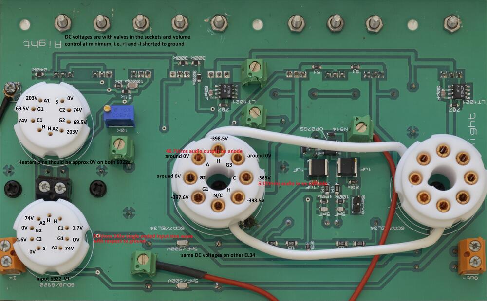 To help people with troubleshooting here are the valve DC operating points measured with respect to ground on a known good stock mini T2. Inputs are shorted to ground. No load on output. All components stock values and DC PSU voltage rails within 1% of schematic when under load. Obviously the two el34s should have identical DC operating points and so should each half of a 6922, the other channel should also match. Exact measured values are going to vary a bit depending upon the valves, exact PSU voltages component, tolerances etc etc. NOTE the EL34 heaters sit at approximately -400VDC. The 6922 heaters are approximately at 0VDC I get a signal gain of approximately 940x with a single ended 1Khz sine wave 0.1Vrms input and an output of 94Vrms between the + and - output pins into a 10Mohm (multimeter) load. Audio enters the EL34s on the cathode and for 0.1Vrms 1khz input I get approximately 5.17Vrms of audio on the cathode, the EL34 amplifies this by about 9 times and gives 46.7Vrms on the anode with respect to ground. The other EL34 operates similarly but opposite phase.1 point