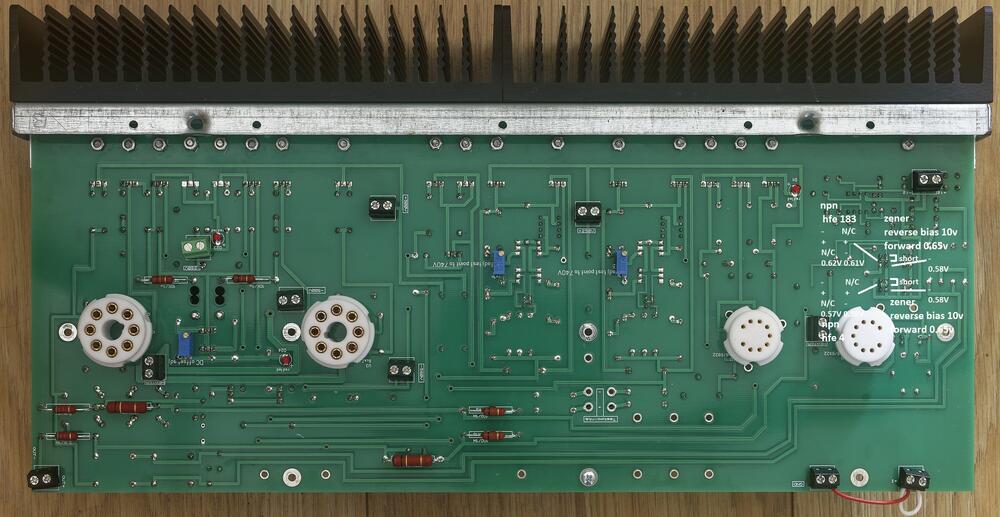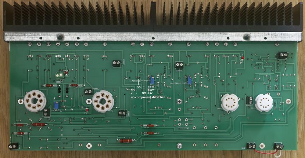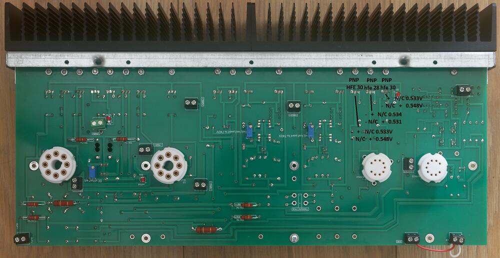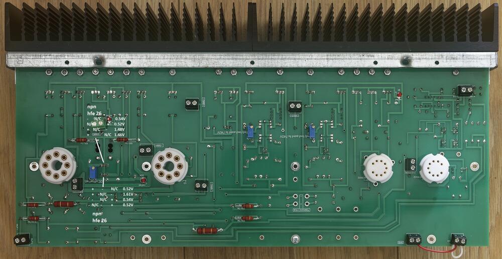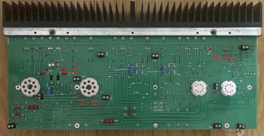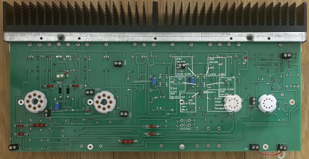 The unofficial mostly modern T2 troubleshooting and verification guide. Weclome, this guide covers the mostly modern T2 which has the following schematic: The gerbers for the amp can be found here: https://drive.google.com/drive/folders/1r3g2TAtBUaBdiMorTWX7yYgeJ7maQbYW and the gerbers are staxt2nc3fdh7.zip The guide is intended for both pre-power on verification of an amp build, verification of voltages on power on and general troubleshooting. All tests are performed using a Brymen BM869s and peak DCA75. Using a different multimeter may effect the results slightly but you should still get similar behaviours and ball-park figures. Transistor and Diode Location Section 1. Build verification with no valves installed and no wires/volume control connected to the amp All of these checks can be performed with a multimeter from the top side of the amp board leds Checks. All 3 leds on each channel should read about 0.55V voltage drop in forward bias (multimeter + terminal/red lead connected to led + and multimeter - terminal black lead connected to led -) and open circuit in reverse bias (swap the probes around) when tested with a multimeter in diode check mode. The leds will not light from the diode test due t the current draw if the components around them. The exact forward voltage drop will depend upon the characteristics of the red led but anything significantly different here indicates a problem. 0 voltage drop in both directions indicates a short across the led or the components it connected to. check for solder bridges and failed short transistors. 0L indicates in both directions means the led has dry solder joints or is blown. using a multimeter in resistance mode check the leds D23 close to the -360VDC psu input. In forward bias expect around 4M ohms. With the probes reversed you should get open circuit. D24 is the led closest to the octal socket for the EL34 and should read about 1.8M in forward bias and about 1.9M in reverse. D1 is between in the 9 pin sockets but close to the heatsinks. This should read about 1.5M in both directions. Readings in both directions of a few hundred K ohms or lower indicate the led may have been leaky or a transistor it is connected to has gone short circuit or a solder bridge. Input terminal checks With the multimeter in resistance mode and the - terminal connected to the amp ground, and the positive terminal connected to the + input of the amp you should get about 340K and the same for the - input. Naturally expect the same results for the other channel. If significantly different suspect incorrect resistors for R94, R7 (positive input). Or R95, R8 on the - input. Output terminal checks With the multimeter in resistance mode and the - terminal connected to the amp ground, and the positive terminal connected to the + output of the amp you should get about 0.5M and the same for the - output. Naturally expect the same results for the other channel. Valve Socket Checks. With the multimeter in resistance mode and the - terminal connected to the amp ground, and the positive terminal expect the following resistances for both EL34s: (socket viewed from the top of the amp). (note the 0.5M reading may start lower and quickly ram up and the small capacitors in the circuit are charged by the multimeter). For the 6922s (socket viewed from the top of the amp) Diode Checks of transistors Note it is possible for a transistor to fail in such a way it has very little gain but still has a diode drop and so diode checking transistors is not a foolproof measure of a transistors health. But 0V drop when not expected indicates a short etc. Diode checks KSA1156 checks Q1, Q2, Q3 two of the ksa1156s (Q2 and A3) measure the same in diode mode the centre one (Q1) differs slightly. All combinations of probes and pins on a transistor result in open circuit unless otherwise shown otherwise: + indicates positive multimeter probe attached, - indicates negative multimeter probe attached n/c indicates no probe attachment. Note: for the other channel EACH KSA1156 is rotated 180 degrees about the y (vertical) axis. Peak DCA in circuit testing Q1-3 The peak DCA 75 identifies all 3 transistors as PNP silicon. The centre with a hfe or around 28 and the other two with slightly higher hfe of 30 to 31. This test is reliable, anything significantly different indicates a problem. Note it is easier to do these tests from the underside although you can hook up the dca proe hooks to something like a sensepeek weighted self standing spring loaded probe tip assembly and test easily from the top (https://sensepeek.com/pcbite-20 Diode check and Peak DCA 75 for Q23P FJPF2145 This is reliably identified as a NPN with hfe 26 and is part of the virtual battery connected to the + output side of the channel. NOTE: It has a mirror image pinout compared to the ksa1156s. Diode check and peak DCA 75 check for Q5 2SK216 This is reliably identified as a N channel mosfet with body diode and has a transconductance of 23.3mA/V. Although not part of the virtual battery it is directly connected to it. WANRING This transistor has a live mounting tab and must be fully insulated from the heatsink. A resistance check from the metal tab to the heatsink it is mounted on absolutely must read open circuit. Diode measurement for this transistor does not show a stable reading. In this case dec indicates a reading that decreases over time. The next two transistors in the heatsink row are Q23N and Q4 which perform exactly the same role and are exactly the same type of transistors as Q23P and Q5 respectively and should measure about the same I got 28mA/V for the Q4 so expect a little variance here). NOTE: on the other channel the order of the 2SK216 and FJPF2145 are reversed. Diode check and peak DCA 75 check for Q35 and Q36 FJPF2145 These are the current providers (driven by Q34) for a 10mA constant current source that feeds the input 6922s. The job is equally divided between them and they should measure the same. The DCA75 reliabl
