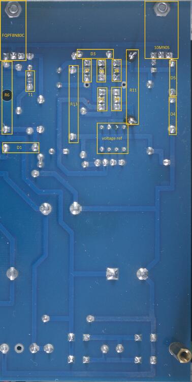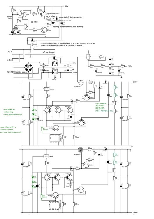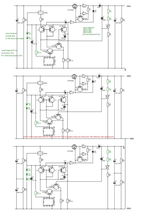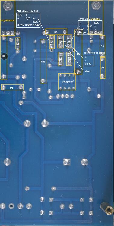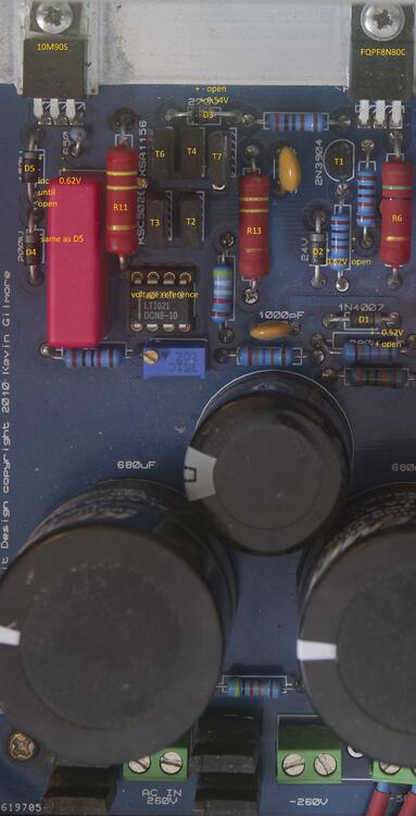 Since the T2 needs a complex power supply I am also including a T2 power supply testing guide. There are multiple options for the T2 power supply but the one I built is: The gerbers can be found here: <insert link> The guide is intended for both pre-power on verification of an amp build, verification of voltages on power on and general troubleshooting. All tests are performed using a Brymen BM869s and peak DCA75. Using a different multimeter may effect the results slightly but you should still get similar behaviours and ball-park figures. All tests are performed with the psu not connected to an amp and no mains transformer connected. unfortunately many of the transistors are packed tightly together so it is not easy or really possible to get test probes onto all the legs of all the transistors from the top and so the verification guide will be separated into two halves: testing from the top and testing from the bottom. Since all the high voltage power supplies are basically identical except for differing values for some resistors ad the pre regulator zeners I will cover one psu rai and the diode tests and dca75 tests should be the same for the other high voltage rails. (The 500V and above rails also have two caps in series with bleed resistors in parallel for the input smoothing and output smoothing to reduce the financial cost of the caps and increase the cap options) The low voltage rails are trivial - diode bridge, bulk cap, monolithic off the shelf regulator and smoothing cap and so will not be covered. NOTE the 3w resistor which direct connects to the 10 volt reference will get hot (depending upon the supply rail) it can reach 80C+, If you look at my schematics above I suggest increasing the value of the resistor to reduce the current and decrease the temperature. Also raise it from the pcb as much as possible to keep it away from the nearby 0.1uF capacitor. NOTE if you use 0.1% precision resistors for the output voltage set resistors then they must be rated at above 250V for the 560V rail or (in my experience if you use 250V rated working voltage resistors their resistance will drift higher and higher with time and the 560V rail will eventually hit the zener string voltage of 600V and this will cause an uncorrectable dc offset in your T2 amp). Transistor and diode location Top The two ksc5026 (T3 and T2) form a long tail pair with T3 input being the 10V reference and T2 input being the the voltage across R5 (and half of P1) in the voltage set string. To improve the performance of the differential amp T6 and T4 form a current mirror. R12 is the common resistor for the long tail. The output of the long tail comes from the collector of T3 and goes to T7. Probe Tests from above Diode test of the zener pre regulator D5 and D4 measuring across each separately, you will get about 0.6V drop, probes reversed the multimeter will register a steadily increasing voltage until it shows open. This is true of each zener in the string. Diode test D2 you will get about 0.6v drop in one direction and an instant open in the other Diode test D1 you will get about 0.52v drop in one direction and an instant open in the other Diode test D3 you will get about 0.54v drop in one direction and an instant open in the other Note it is possible for a transistor to fail in such a way it has very little gain but still has a diode drop and so diode checking transistors is not a foolproof measure of a transistors health. But 0V drop when not expected indicates a short etc. Diode and dca75 tests of the 10m90s NOTE the 10m90s has a live tab and absolutely must be insulated from the heatsink it is mounted to. Like the 10m90s in the t2 amp boards the 10m90s measures the same when the polarity of the probes has been reversed. Just like the T2 amp the peak dca75 can't identify this component in circuit and variously shows it as a low voltage zener ~ 1.6V or an led. Diode and dca75 tests of the fqp8n80s The peak dca75 can't identify this component in circuit and variously misidentifies it as two diodes or a diode and led. Diode checks from underside Transistor and diode location Bottom Diode test T1 2N3904 NPN transistor. forms the active part of the current limit circuit. It monitors the current through R15 and when the voltage drop across the resistor gets too high T1 starts to cut off the pass mosfet FQPF8M80C. If you get correct voltage output with no load but any load massively decreases the output down to about 75V suspect T1 has gone short circuit. Diode and DCA 75 test T2 and T3 KSC5026 NPN transistor. These form the long tail pair differential amp which compares the voltage reference against a portion of the output voltage controlled by the trimmer P1 and the series resistor ladder R3, R4 R5. There should be very close to 10V across R5 if not one possibility is R3 and R4 have too higher a resistance value, possibility from using resistors with a too low working voltage - especially in the -560V rail which puts more than 250V across each of R3 and R4 in the series ladder. NOTE T2 is connected to a both ends of a cap and so this cap will slowly charge resulting in the diode test reading showing an increasing voltage drop until the multimeter finally displays open when the cap has charged to the same voltage as the meter outputs and so no current flows at all fooling the meter into thinking there is an open circuit. This does not occur with T3 The dca75 reliably and correctly identifies T2 as a NPN silicon transistor hfe 19 and T3 as a NPN silicon transistor hfe 2. Diode and DCA75 test T4, T6 T7. Ksa156 PNP transistor. T4 and T6 form the current mirror for the long pair differential amp. NOTE T4 has base and collector shorted together and so measures similarly to a single diode. The DCA correctly and reliably identifies T7 as a PNP transistor hfe 135 The DCA obviously identifies T4 as a diode junction if you don't connect the 3rd lead, otherwise it just reports a short between two of the leads - which is correct. The