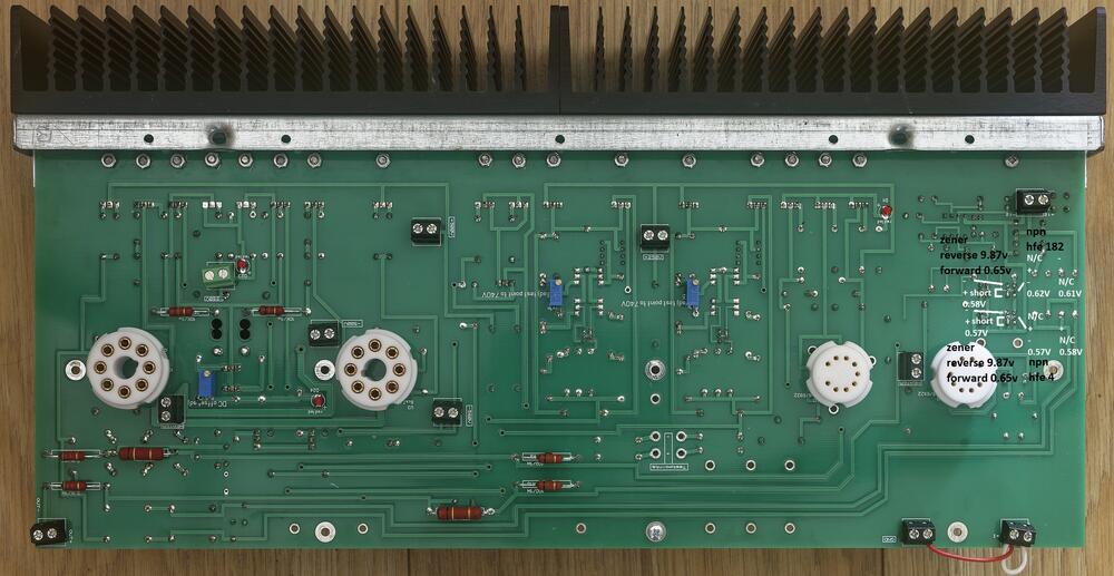 update on the RIP T2. The four 270K resistors R65 to R68 are discoloured I believe because of the higher than expected DC voltages across them from the massive DC imbalance. Otherwise there are no visible signs of problems. I found a dead 2SK216 in addition to the dead 2SJ79 on the same channel that the 6922 failed on. Diode testing found the dead J79 but to find the dead K216 I used my peak dca75 to measure the two ksa1156s and found radically different hfe measurements (43 vs 143) so I removed the other J79 and the readings were dd not change. The removed J79 measured ok. So I suspected the K216es and removed them 216es one measured good and one bad. The good K216 was connected to the bad J79 and good J79 connected to the bad K216... The ksa1156es measured the same hfe when the 4 transistors were removed so I believe they are ok. I'm replacing all 4 mosfets with ksa1220A and KSC2690A because that's all I have... The other channel had the same imbalance issues and one of the K216es there is dead too. Both channels now have 1220 and 2690a installed. But I noticed that the ksa1156s on the channel with the failed 6922 measured hfe 51 in circuit and the channel with only the single failed k216 the same ksa1156s measured 2hfe. Hmm... looking at the circuit I decided to measure the resistance across led between the emitter and base of the ksa1156es... channel with the failed 6922 about 150K and about 190K leads revered. Channel with single bad k216 about 3.4M and open when reverse biased... So either the led or the ksa1156s where leaking. Desoldered the ksa1156s and tested them... ok. desoldered the D23 led and replaced it. Now 3.4M and open circuit. So the led had gone leaky. At least both channels now measure the same... The other led close to the EL34 (D24 ) on the channel with the dead 6922 is also leaky . So score so far: right channel 6922 shorted heater to cathode K216 DCA75 measures it as a zener diode J79 DCA75 measures it as two diodes Led Brymen bm869s measures it as a 150K resistor Led Brymen bm869s measures it as a 88K resistor Left channel K216 DCA75 measures it as zener diode1 point