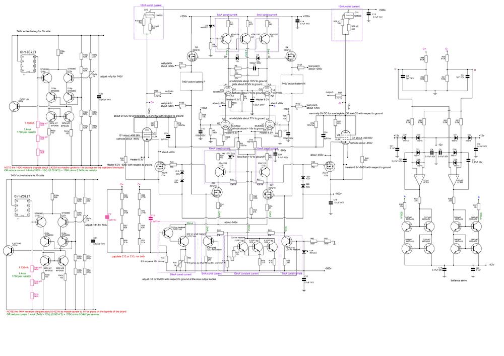 😃Was trying not to dump more flat-earth theories of T2 to the thread as I already did a bunch, but here are what (I think) my problems were: I didn't find the cause of the oscillations appeared at the output, but they are killed by upping the feedback caps from 5pf to 10pf. Some "AC components" I measured around output plate CCS might actually be oscillations excited by me sticking my handheld meter probes across floating nodes - I recall when I measure referencing ground it was different but better, but in the end when I probe with oscilloscope I see nothing there. When I trim both channels in place, turns out the 10M90S in -500V rail reached the boundary of current limiting so it's trying to sag and gives a sawtooth wave on that output rail voltage, hence appeared at the amp output. Lowering the current limiting resistors fixed it. When it comes to getting preamp tubes for T2, probably the most important and minimum requirement for the circuit to work is to have well-balanced triode sections for each individual tubes. Some permutations of the quad JJ tubes I got will give too much imbalance that is outside the correction range of the servo. Also I find my left channel having more tolerance on input tube mismatch for the servo to correct than the right channel - suppose the better matched the rest of the circuit is, the more tolerance on input tube mismatch you will get.1 point