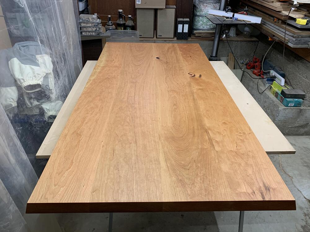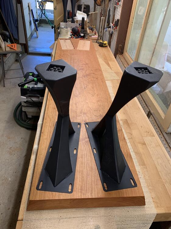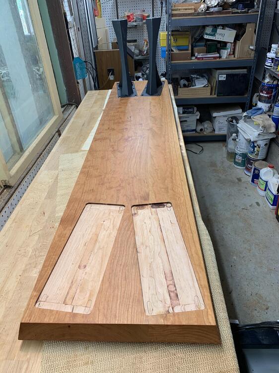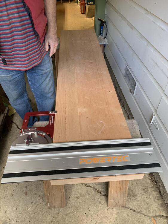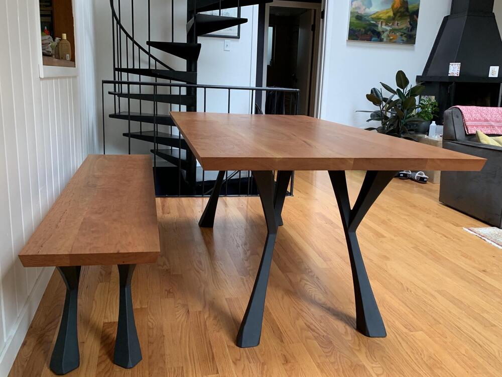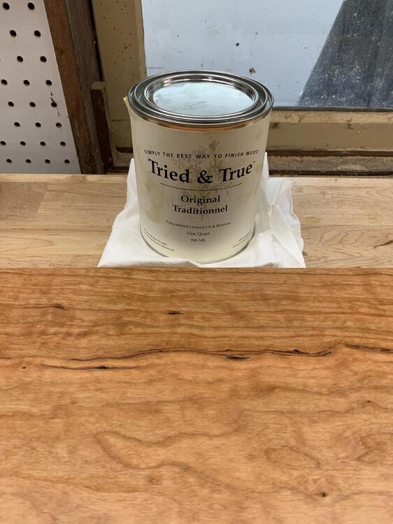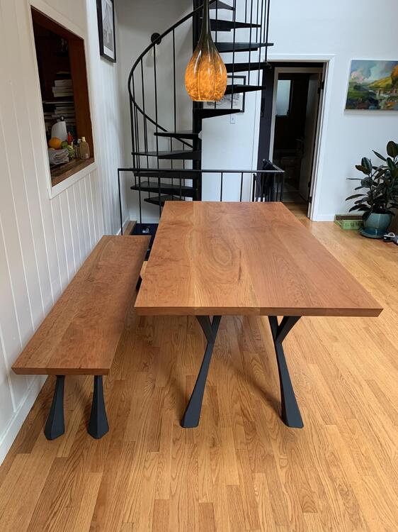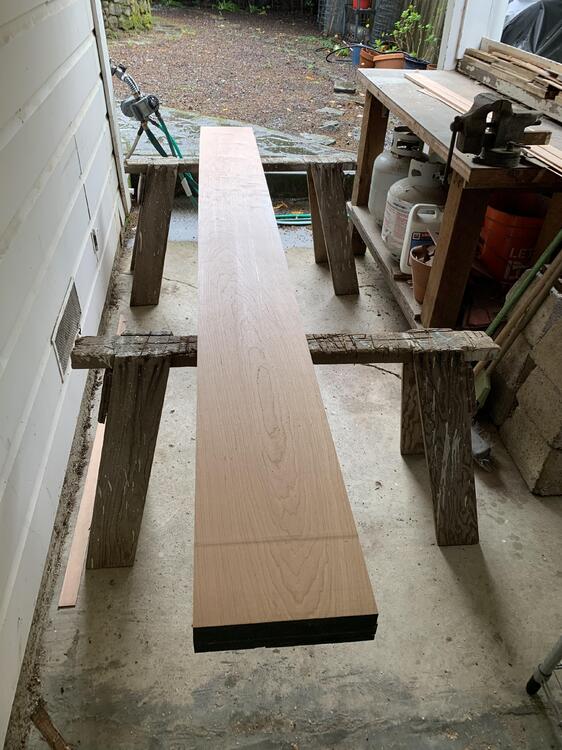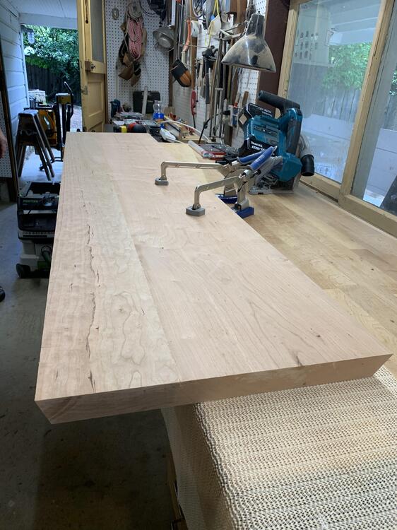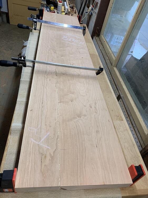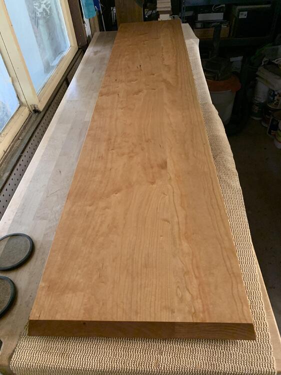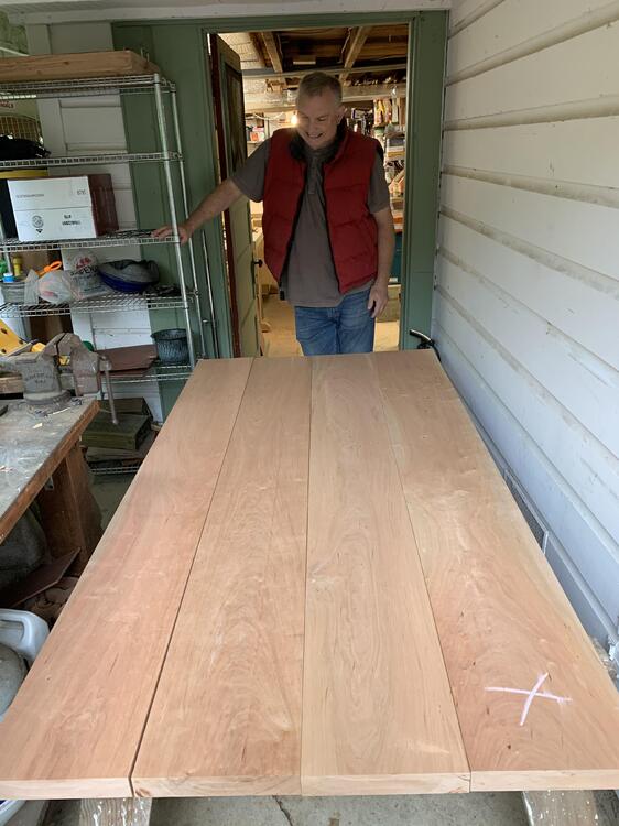 This is going to be tl:dr for many, but Steve and I have delivered the first completed project from our Shelter Shop. By far the biggest woodworking project I have attempted, and both Steve and I are very proud of the results. Steve, Claire and I promised to build a dining room table and bench as a wedding present for Claire's sister and her new wife. Here are some pics during the process of building through yesterday's delivery. I forgot to take pictures of the 8/4 (aka 2") cherry wood boards before we started milling them down, but the lumber was excellent. We only ended up with one board that was twisted a bit, and we were still able to use it. Here is a board after some planing for thickness, and you can see the planer snipe several inches from the end, which we cut off anyway. After planing and then jointing an edge, we chop sawed the boards to rough length and then cut them to width on the table saw. The top is four boards and the bench is two. Next, we cut in mortises on the mating edges of the table and bench boards to receive floating tenons. I forgot to take pictures of that process using a Festool Domino machine, but you can see the mortises in the first picture below. That is the two halves of the table top being glued up before gluing them together later. After everything was glued up and cured, we used a track saw to cut them to final length and width. All edges have a 15 degree angle, which turned out great. Next up was sanding and finishing. We sanded from 80 or 120 through to 320 grit, and the cherry was smooth as a baby's butt. We then applied two coats of raw linseed oil followed by two coats of Tried and True original finish, which is linseed oil and beeswax. Ultimately, we also put on a coat of carnuba wax because Thos Moser does its oil finished furniture that way, which is good enough for me. Here is a piece of raw cherry next to the bench top with some linseed oil applied. This is the bench top after the first coat of Tried and True. This is great stuff that Doug introduced me to, and I love. You don't even need to wear gloves it is so natural and your hands feel better after applying some than before. We bought metal legs for the table and bench from a seller on Etsy, and they turned out to be even better than expected. We decided to rout out the underside to accept the base plates, and we also used threaded metal inserts so we could use machine screws rather than wood screws. It is very sleek and worked beautifully. We assembled everything at my house to make sure it was all good, then wrapped it up with moving blankets yesterday for delivery. We haven't been around my sisters in law for a couple of weeks so we took precautions and wore PPE. The table and bench look pretty stunning in place, and like I said, Steve and I are very pleased with the outcome. The happy couple are even more thrilled with the finished product and have been obsessively looking for the perfect chairs to complete the set. The cherry will darken over time and will only become more beautiful. Another great thing about the Tried and True finish is that it can be maintained with an occasional waxing, or it can be freshened up or repaired if necessary without the need for stripping the original finish first. From buying the lumber on March 20 to installation on April 5 is pretty quick work. Now, we have to finish another project already under way, and then move on to other projects. This Shelter Shop will stay busy for the duration, assuming we both stay healthy. Thanks for reading if you got this far. 😁22 points