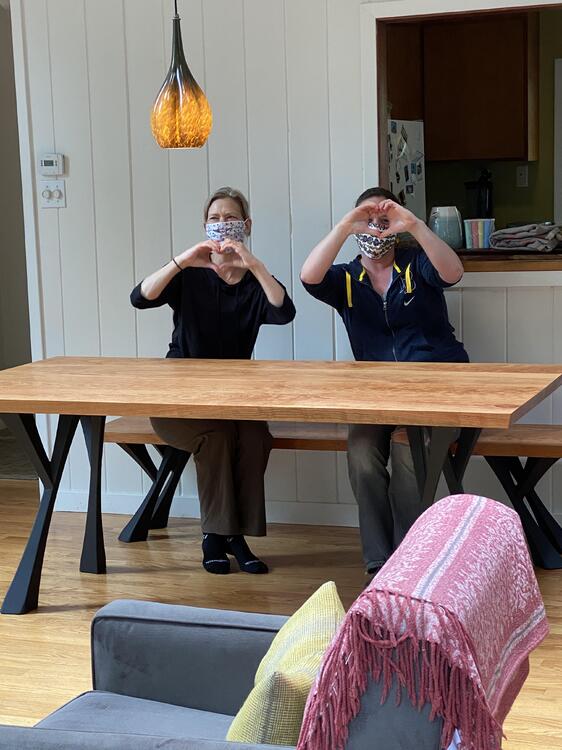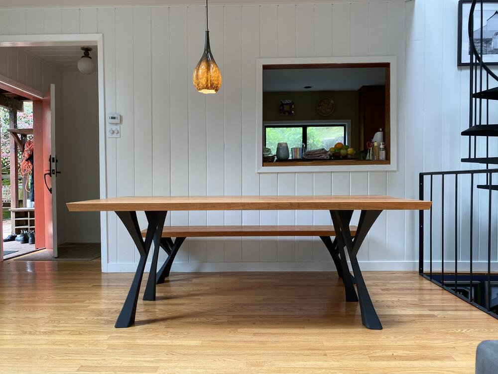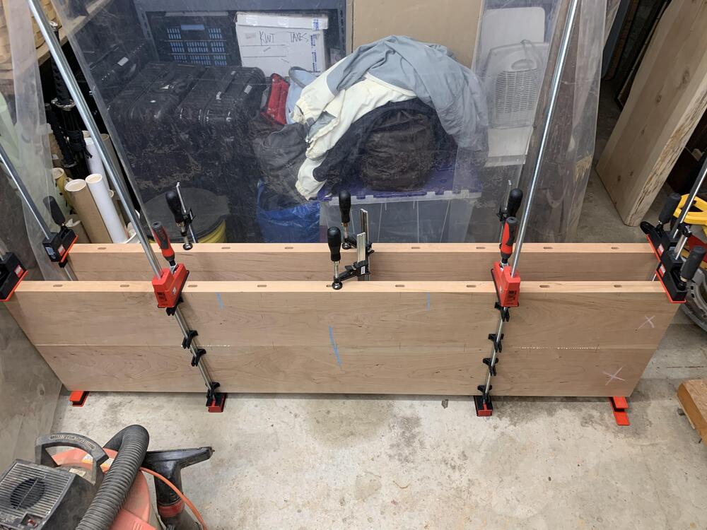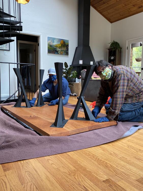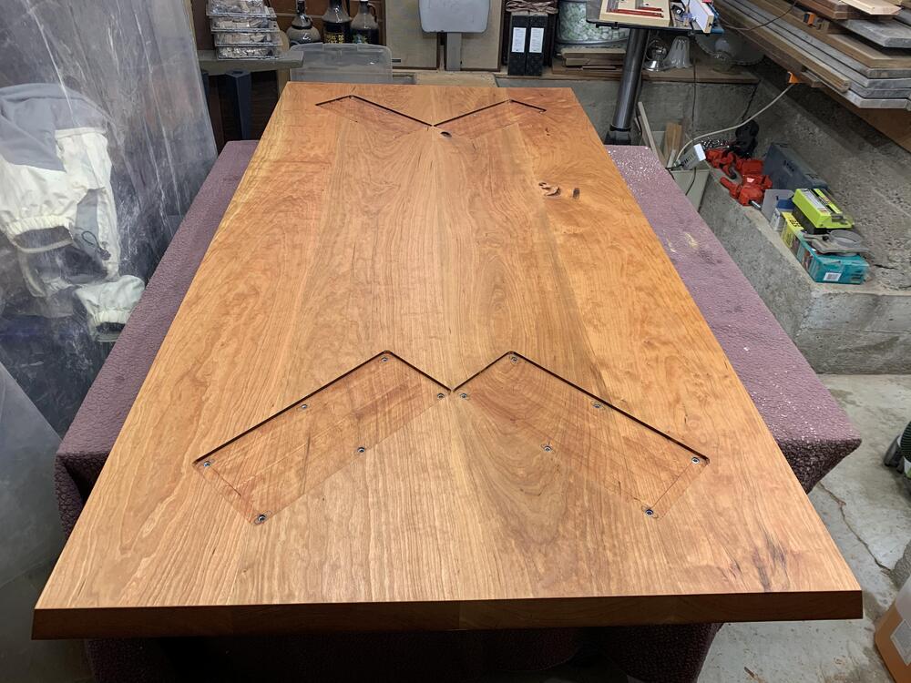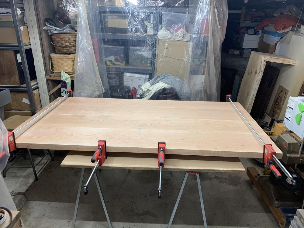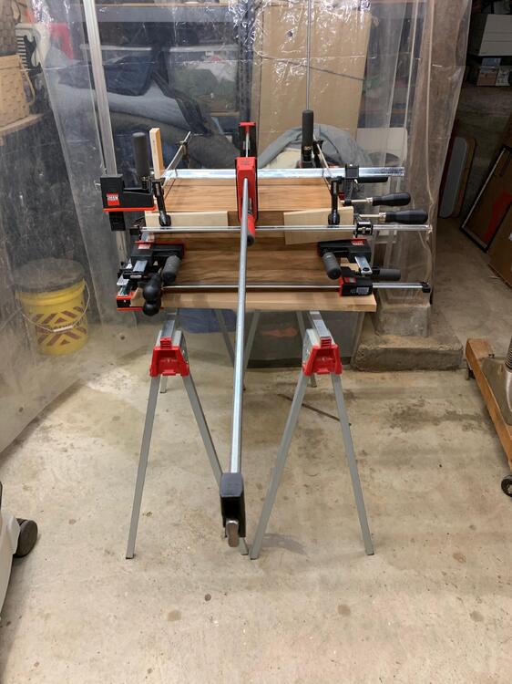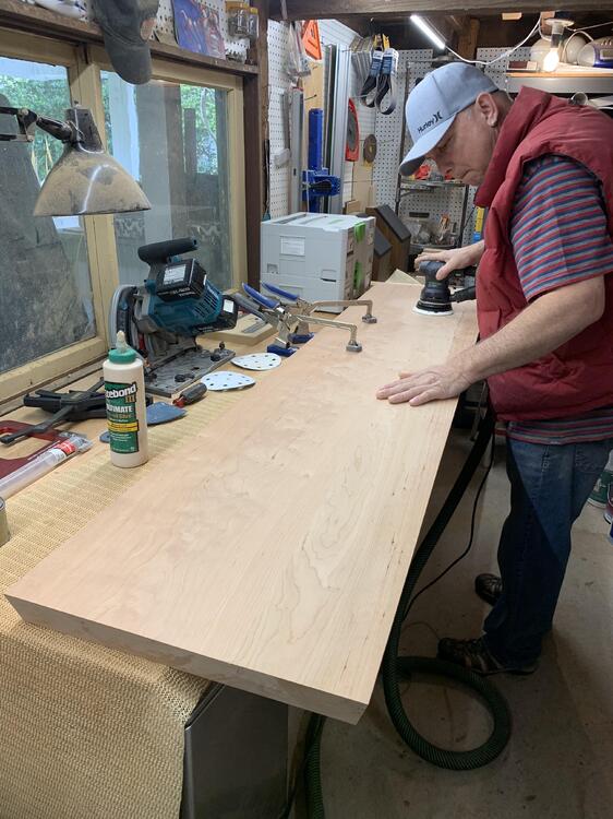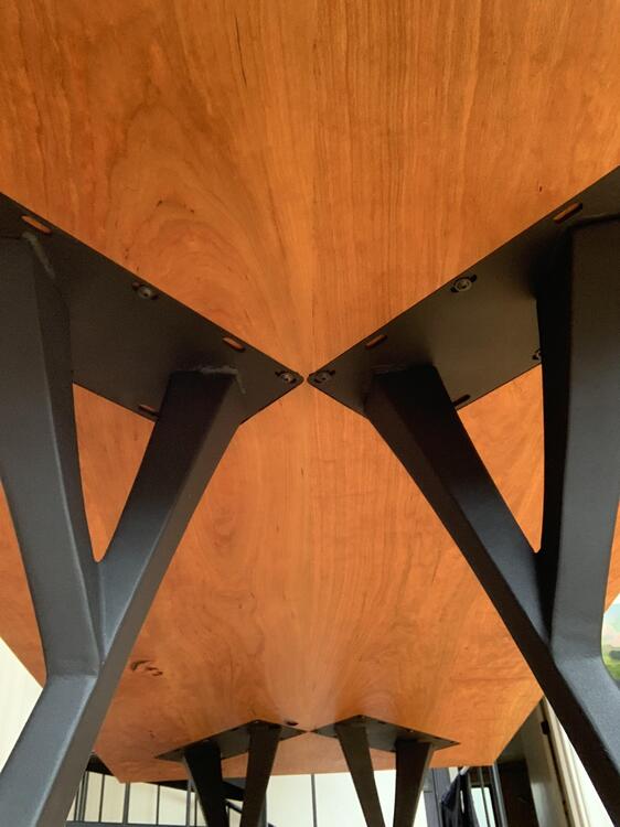 This is going to be tl:dr for many, but Steve and I have delivered the first completed project from our Shelter Shop. By far the biggest woodworking project I have attempted, and both Steve and I are very proud of the results. Steve, Claire and I promised to build a dining room table and bench as a wedding present for Claire's sister and her new wife. Here are some pics during the process of building through yesterday's delivery. I forgot to take pictures of the 8/4 (aka 2") cherry wood boards before we started milling them down, but the lumber was excellent. We only ended up with one board that was twisted a bit, and we were still able to use it. Here is a board after some planing for thickness, and you can see the planer snipe several inches from the end, which we cut off anyway. After planing and then jointing an edge, we chop sawed the boards to rough length and then cut them to width on the table saw. The top is four boards and the bench is two. Next, we cut in mortises on the mating edges of the table and bench boards to receive floating tenons. I forgot to take pictures of that process using a Festool Domino machine, but you can see the mortises in the first picture below. That is the two halves of the table top being glued up before gluing them together later. After everything was glued up and cured, we used a track saw to cut them to final length and width. All edges have a 15 degree angle, which turned out great. Next up was sanding and finishing. We sanded from 80 or 120 through to 320 grit, and the cherry was smooth as a baby's butt. We then applied two coats of raw linseed oil followed by two coats of Tried and True original finish, which is linseed oil and beeswax. Ultimately, we also put on a coat of carnuba wax because Thos Moser does its oil finished furniture that way, which is good enough for me. Here is a piece of raw cherry next to the bench top with some linseed oil applied. This is the bench top after the first coat of Tried and True. This is great stuff that Doug introduced me to, and I love. You don't even need to wear gloves it is so natural and your hands feel better after applying some than before. We bought metal legs for the table and bench from a seller on Etsy, and they turned out to be even better than expected. We decided to rout out the underside to accept the base plates, and we also used threaded metal inserts so we could use machine screws rather than wood screws. It is very sleek and worked beautifully. We assembled everything at my house to make sure it was all good, then wrapped it up with moving blankets yesterday for delivery. We haven't been around my sisters in law for a couple of weeks so we took precautions and wore PPE. The table and bench look pretty stunning in place, and like I said, Steve and I are very pleased with the outcome. The happy couple are even more thrilled with the finished product and have been obsessively looking for the perfect chairs to complete the set. The cherry will darken over time and will only become more beautiful. Another great thing about the Tried and True finish is that it can be maintained with an occasional waxing, or it can be freshened up or repaired if necessary without the need for stripping the original finish first. From buying the lumber on March 20 to installation on April 5 is pretty quick work. Now, we have to finish another project already under way, and then move on to other projects. This Shelter Shop will stay busy for the duration, assuming we both stay healthy. Thanks for reading if you got this far. 😁22 points