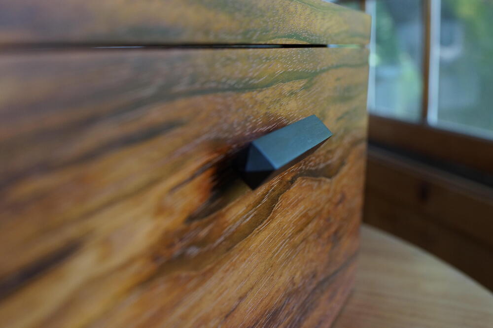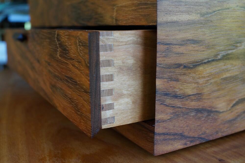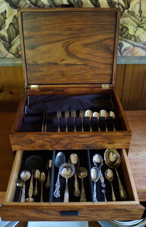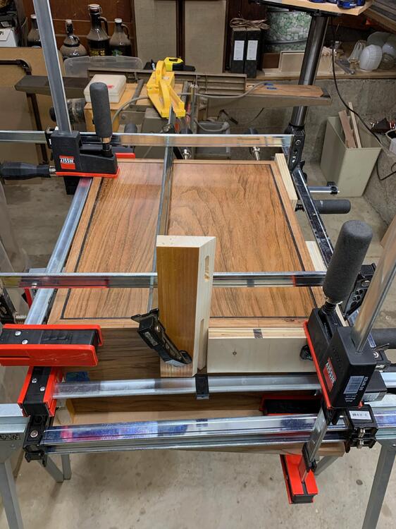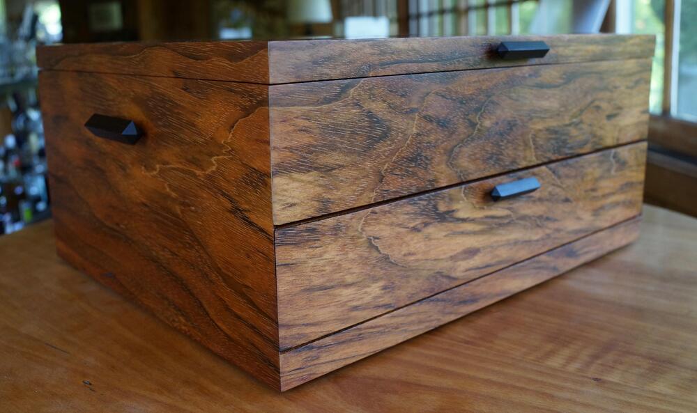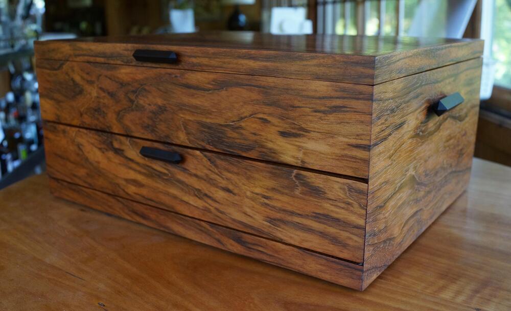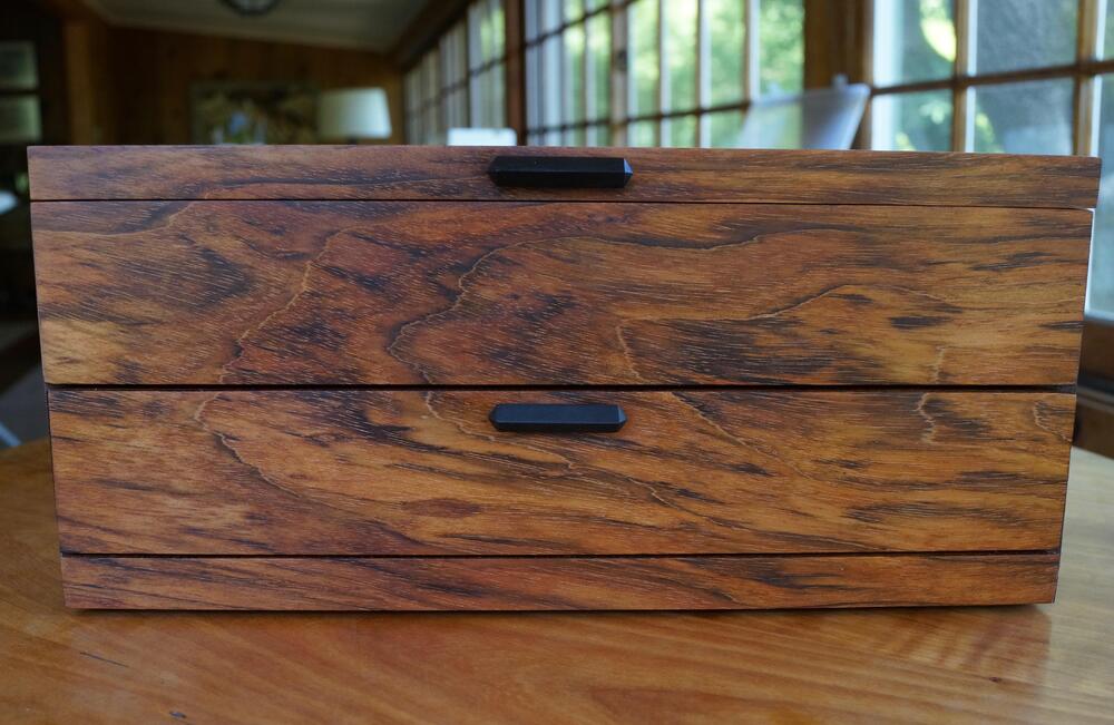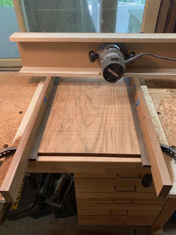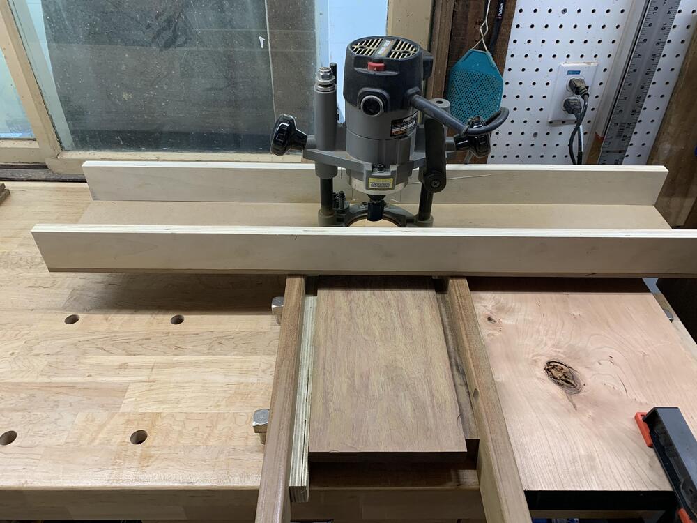 This morning I put the final touch on the silverware chest that Steve and I have been building by installing the insert that holds our silverware set. I bought it from Rockler and designed the chest around it. I'm proud of the chest and think it is beautiful even though it is not completely perfect in every way, and I certainly never could have done it without Steve. We made the chest from a single large board of jatoba wood and it turned out to have some twists and warps that were a bear to manage. Also, it has high mitered corners and my design idea was to wrap the grain from the left side, across the front and continue onto the right side. The lid is also mostly a single piece with sides formed by the sides of the box and an ebony border around the insert. It was by far the most complicated thing I have ever attempted and Steve claims the same for himself. I am going to post a bunch of pictures of the finished product, but not the blow by blow building shots as I did with the dining table from last month. I don't want to bore everyone and I don't have many photos anyway. The only two parts that I am going to highlight are the lid and the horizontal routing we did to make an ebony inlay on the edge of the drawer opening (which covered a mistake we made earlier). The lid piece was too big for my router so I had to build a router sled and route it that way. The first pic shows the setup with a dummy board, the second the jatoba board while being routed, and the third pic down shows the board after routing and a first sanding. It was a cool exercise. The horizontal routing was done on the router table Steve and I built, which can be tipped 90 degrees so that the bit extends outward horizontally, duh, and allows for tenons to be cut precisely. It worked great to make a slot for the ebony insert that is exposed when the drawer is pulled out. Lastly, here is the box when we glued it up with the lid still part of the box. Steve's plan all along was to build it this way and then cut off the lid an inch down from the top so that it would fit together with the box perfectly. It worked to an extent, but the twists and warps in the wood made it much more difficult to accomplish and not quite "perfect." So, the rest of the pics are just the chest in some detail to show the continuous grain wrapping around the three sides, and the ebony accents and the handles that we made from ebony as well. It was anxiety inducing and I definitely lost sleep along the way (covid is to blame as well), but the results are pretty fabulous imho.24 points