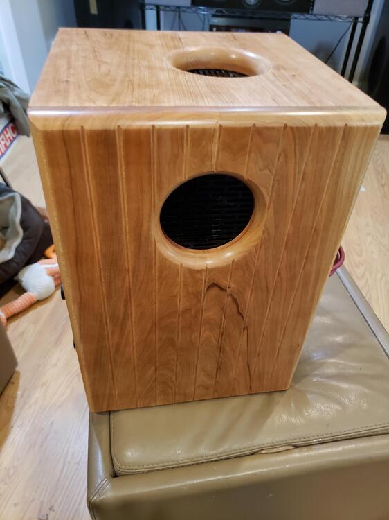 Milo and I got the speaker boxes mostly complete today. Made some round holes and some rectangular panels. Tweeter holes are in the Cherry baffles only, as they're not deep enough to need holes in the MDF panel too. Woofer holes and port tube holes in back. Cherry baffles got milled and drilled as well. And the first coat of Arm-R-Seal. The fluting is strictly aesthetics.20 points