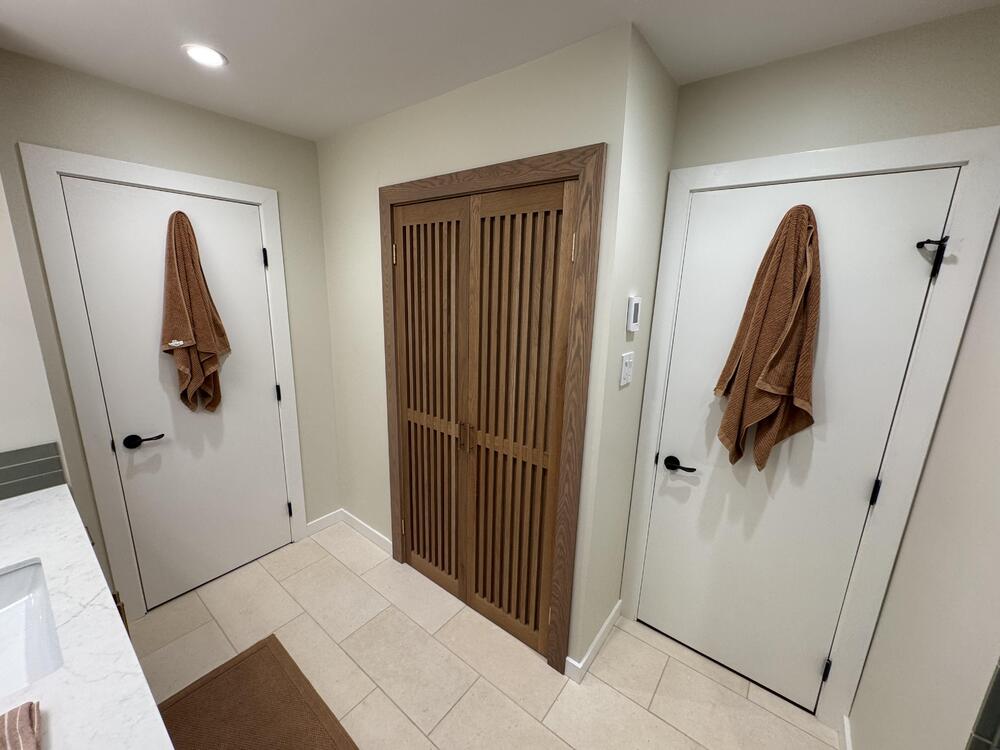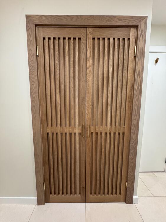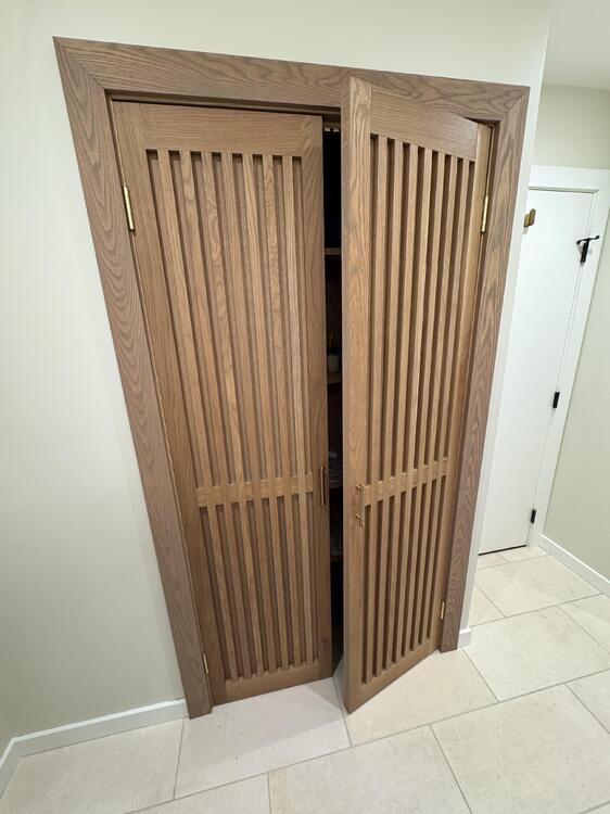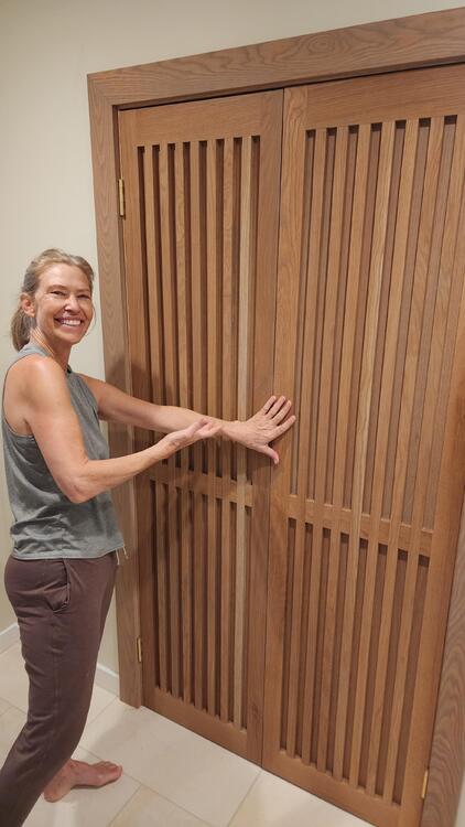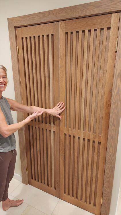 Installed the doors this morning. I aborted the installation last Sunday, because I didn't want to take the chance of scratching/denting them trying to reach my lumber rack by myself. Today I had the owners help and her pickup. I'm always nervous, even though I measured three times. There's just no room for even 1/16" of error. Luckily they fit perfectly.5 points