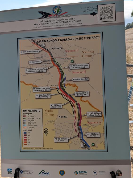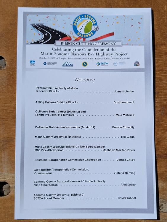 Yesterday, Joanne invited me to a work event to celebrate the completion of a project that has been almost three decades from initial conception to completion . Marin-Sonoma Narrows widening project hits 'huge milestone' https://www.marinij.com/2025/09/29/marin-sonoma-narrows-widening-project-hits-huge-milestone/ Major Bay Area highway project started 13 years ago to reach milestone https://www.sfgate.com/bayarea/article/major-bay-area-highway-project-milestone-19392283.php There was themed schwag And carbs A roster of relevant speakers Who mentioned all those "without whom this would not have been possible" plus federal, state and local funding sources. Then onto the photo ops And the ribbon cutting Note the last minute CHP entry. It's not often you get to see CHP in their dress uniform ties (or bow ties and boots in the case of the Motor Cycle riders) And yet some people are never happy Bay Area drivers still furious after Highway 101 widening https://www.sfgate.com/travel/article/bay-area-drivers-still-furious-highway-101-21074054.php8 points