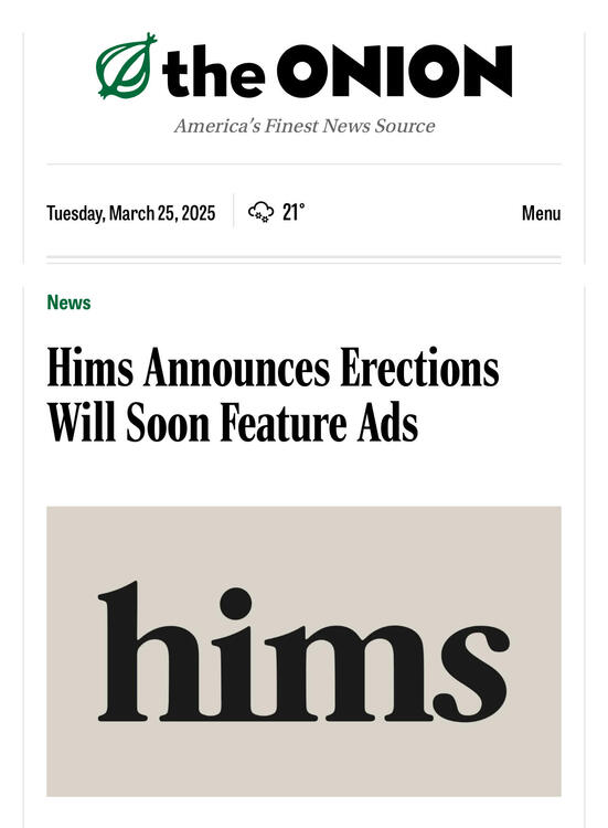 Yes, they have. https://theonion.com/hims-announces-erections-will-soon-feature-ads/ “In an effort to provide better service and keep our industry-leading sex chews affordable, users of our lower-tier medication plans will begin seeing 15-second ads playing on their erections,” said Hims spokesperson Clara Montoya -