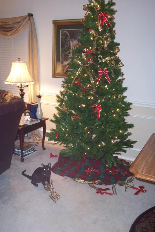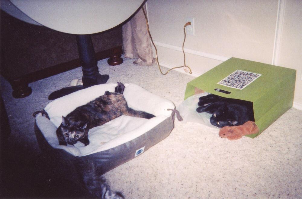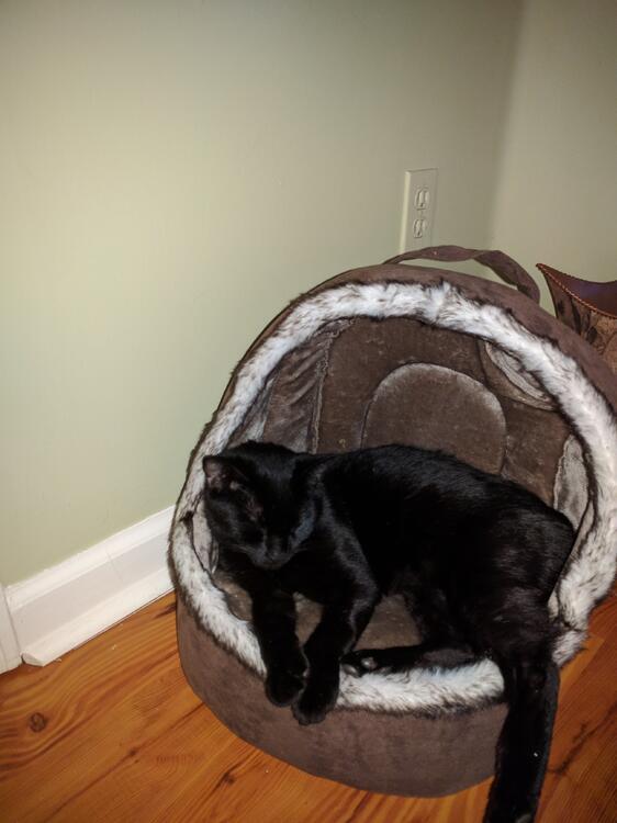 For some reason, the text didn't save.The cat on the bed is Jack, the wild one. He's seems comfortable enough to snooze with his feet in the air. He's the top cat on the sofa, the other is Ebony, my 20 year old. A long time ago she was just a sad sickly little kitten in the animal shelter.