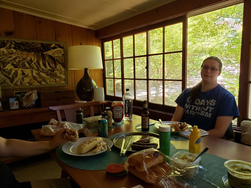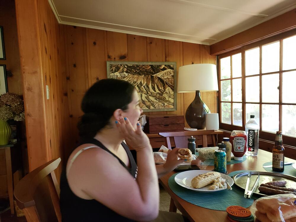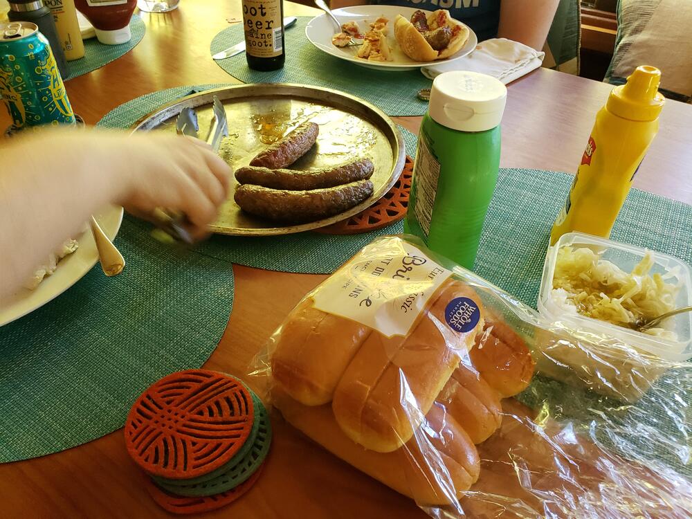 Brats, potato salad, chips and dips and other assorted goodies that Dorothy got. Having cake, strawberries and cream later. I found out that my gay gene didn't override my grilling gene. I grilled the brats and corn on the cob, and it was awesome. Believe it or not it's my first time ever grilling. Yes Al, I remembered to turn off the grill.