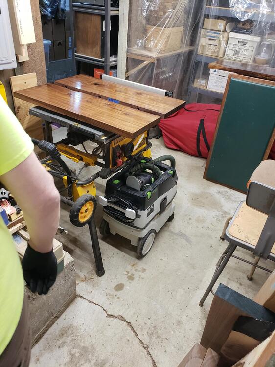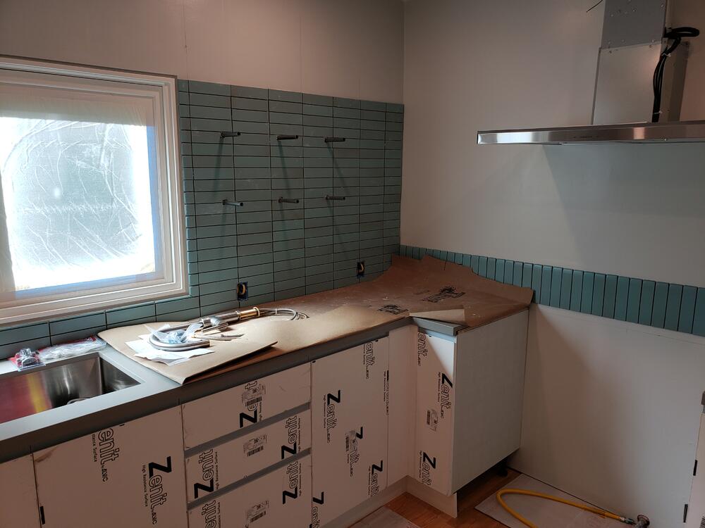 Milo and I hung and plumbed a range hood vent for the kitchen. Then we assembled the new tile saw and started tiling in the kitchen. It went pretty smooth. Milo is already pretty good at setting and cutting tile after only 4 hrs.