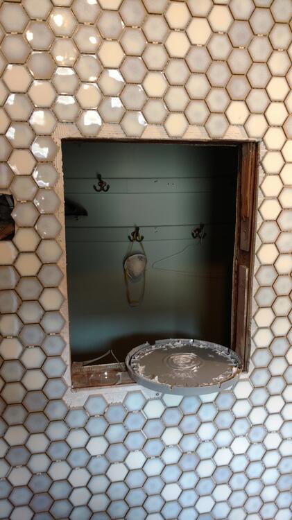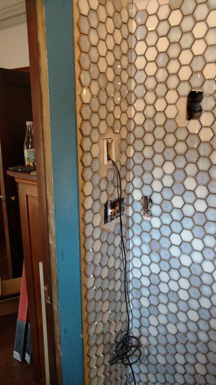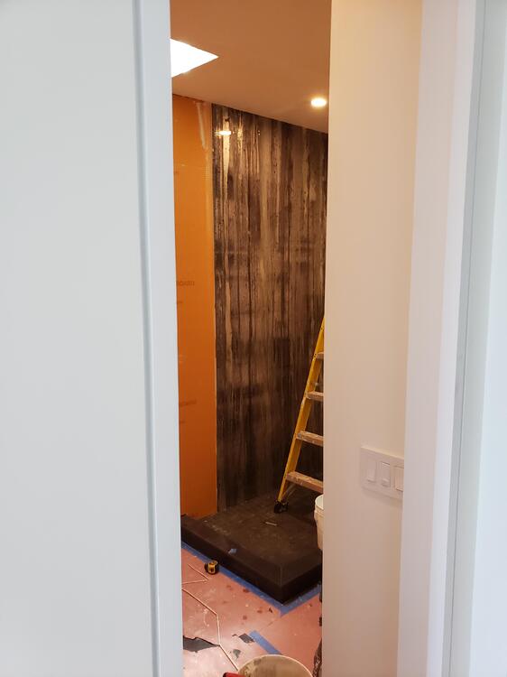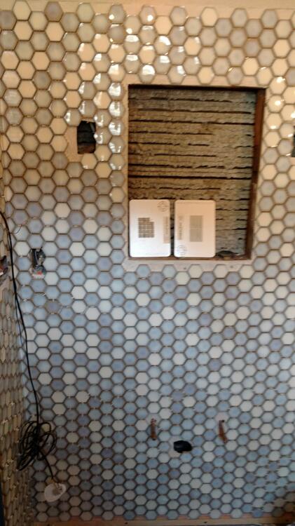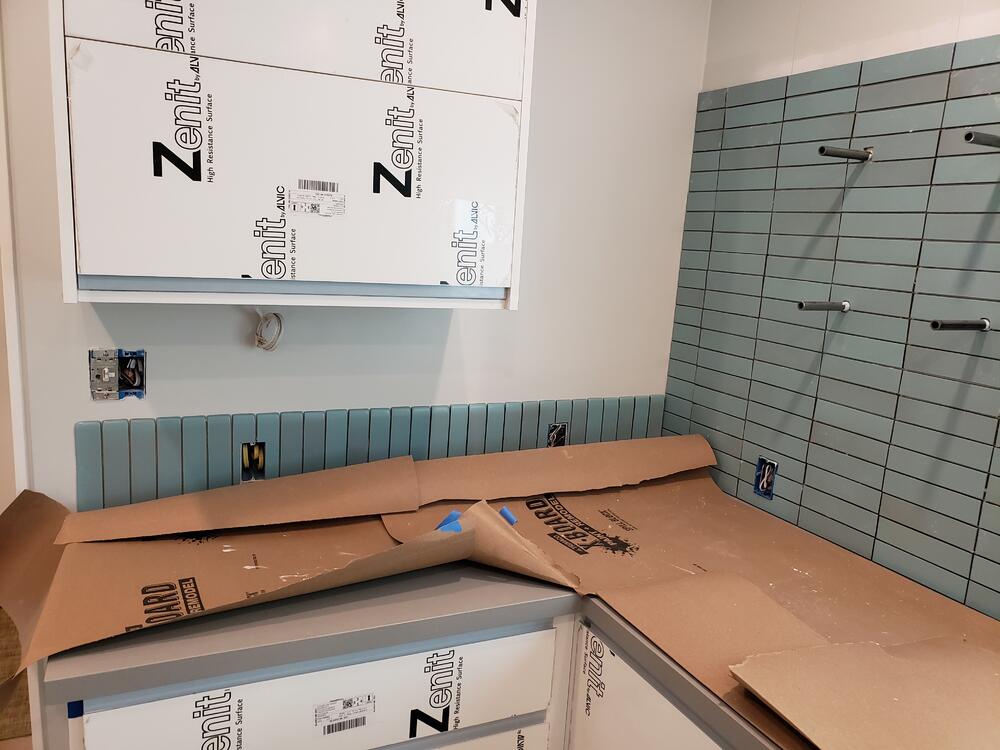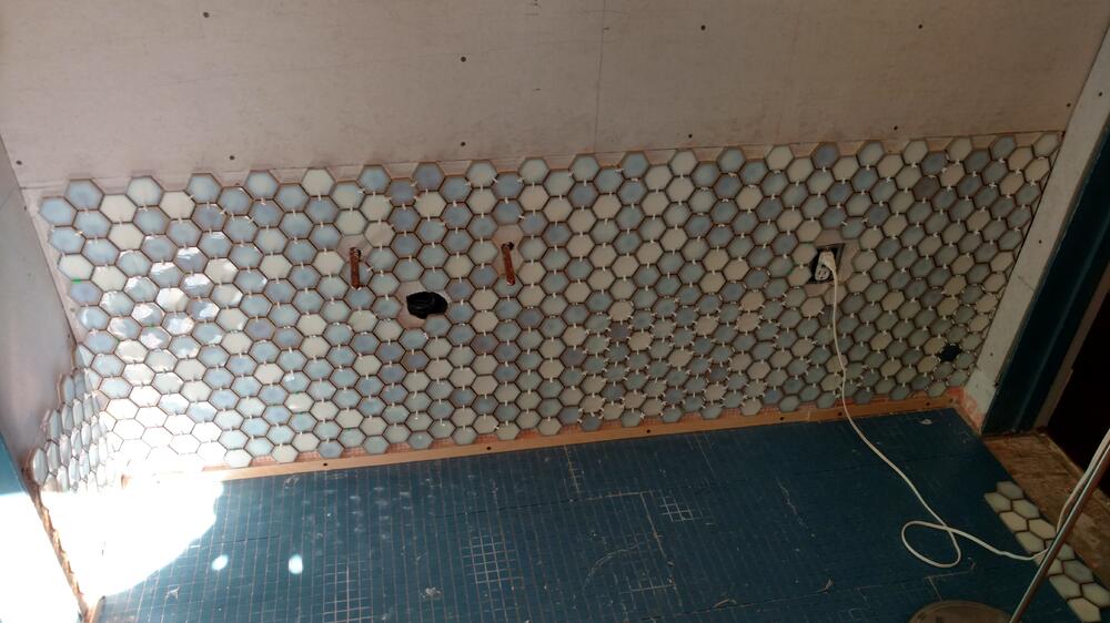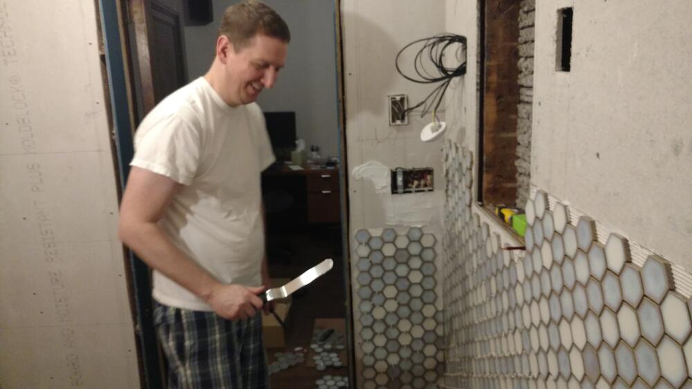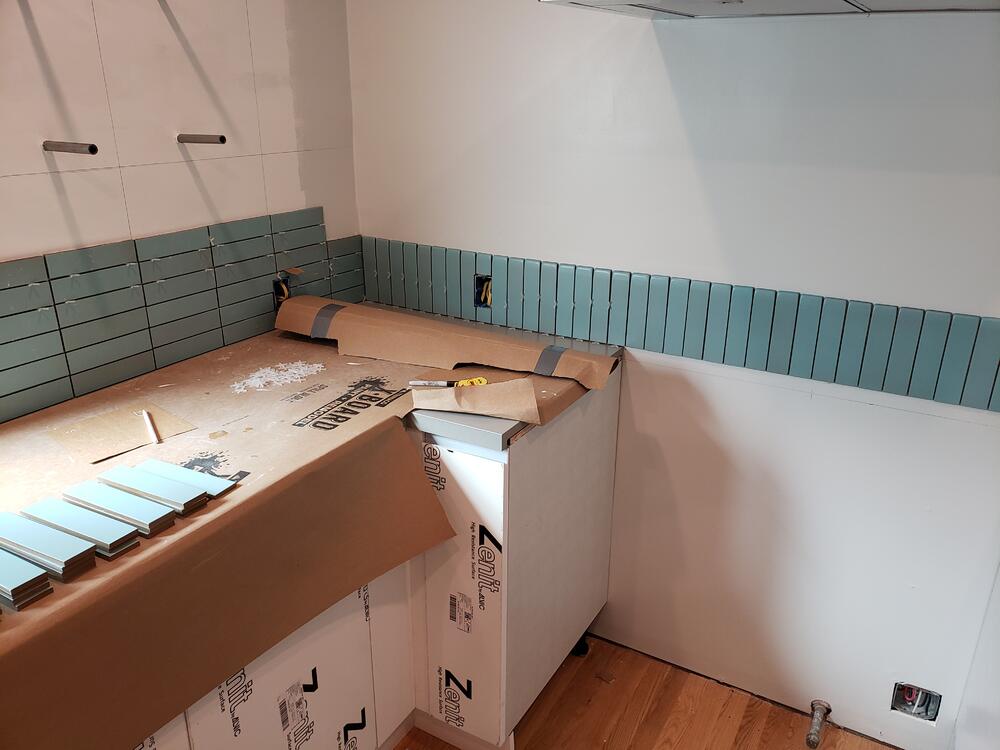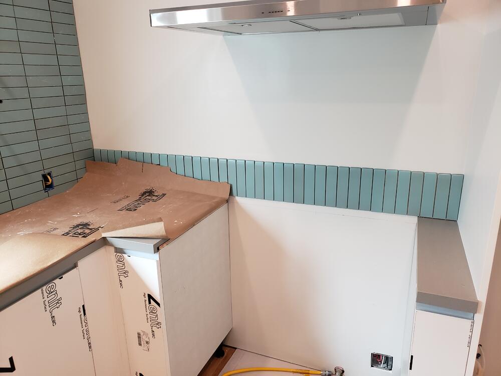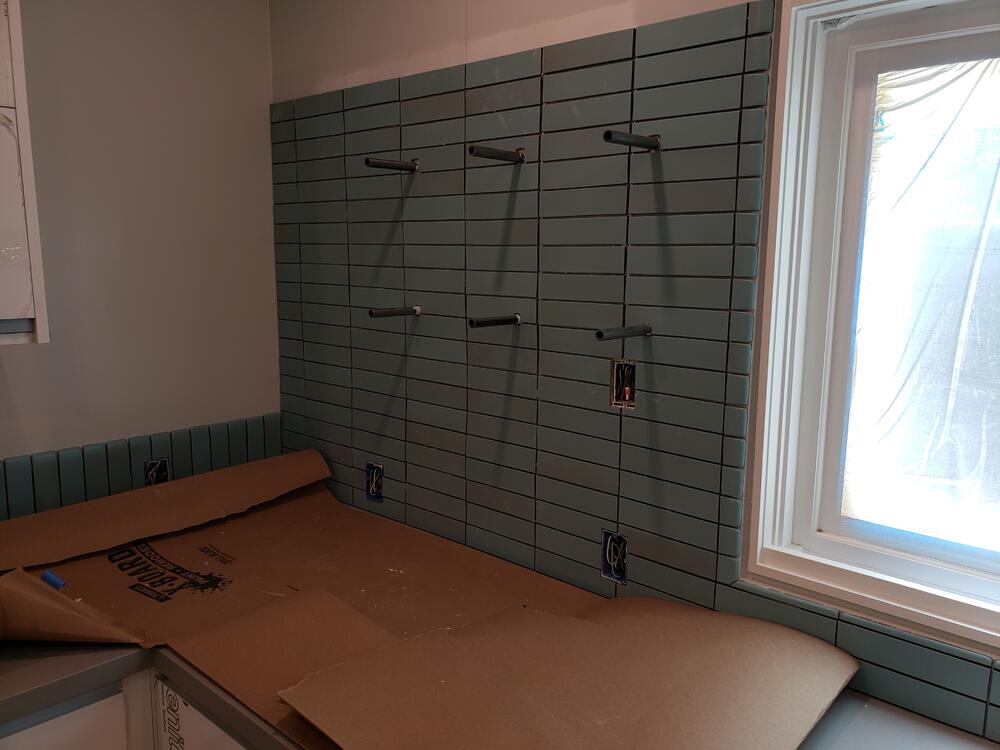 It's a handmade tile, so you get the variation in color, but also the variation in size. Some tile setters hate that, because you can't just rely on spacers. I really like the organic look. Milo and I just draw grids on the wall and rely more on our eyes. The cabinets are matte White, or will be once we remove the protective film. The Walnut shelves should really pop on top of the tile, but the homeowner wants a more matte finish than our current Satin clear coat, so a quick sanding with 240 and a new top coat of matte. Plumbing happens tomorrow and electrical trim out on Monday. We'll finish tile setting Tuesday, and should be grouting soon after that. Nate, the homeowners cut it close on tile. A little closer than I'm comfortable with, but it cuts easily, so we haven't actually ruined a single tile yet. But I'll let you know. It's my second favorite tile I've set thus far. The first being the gorgeous tile we set in Doug's master bath.