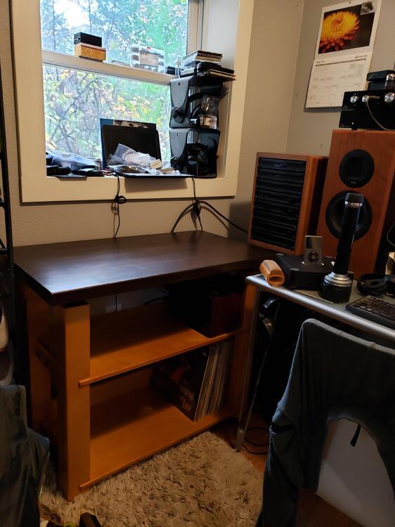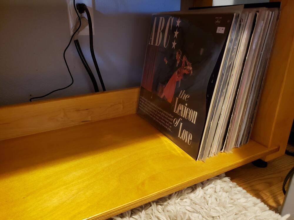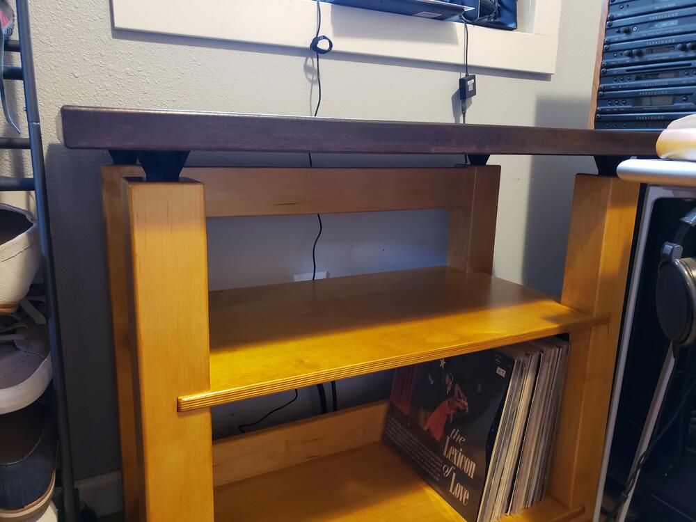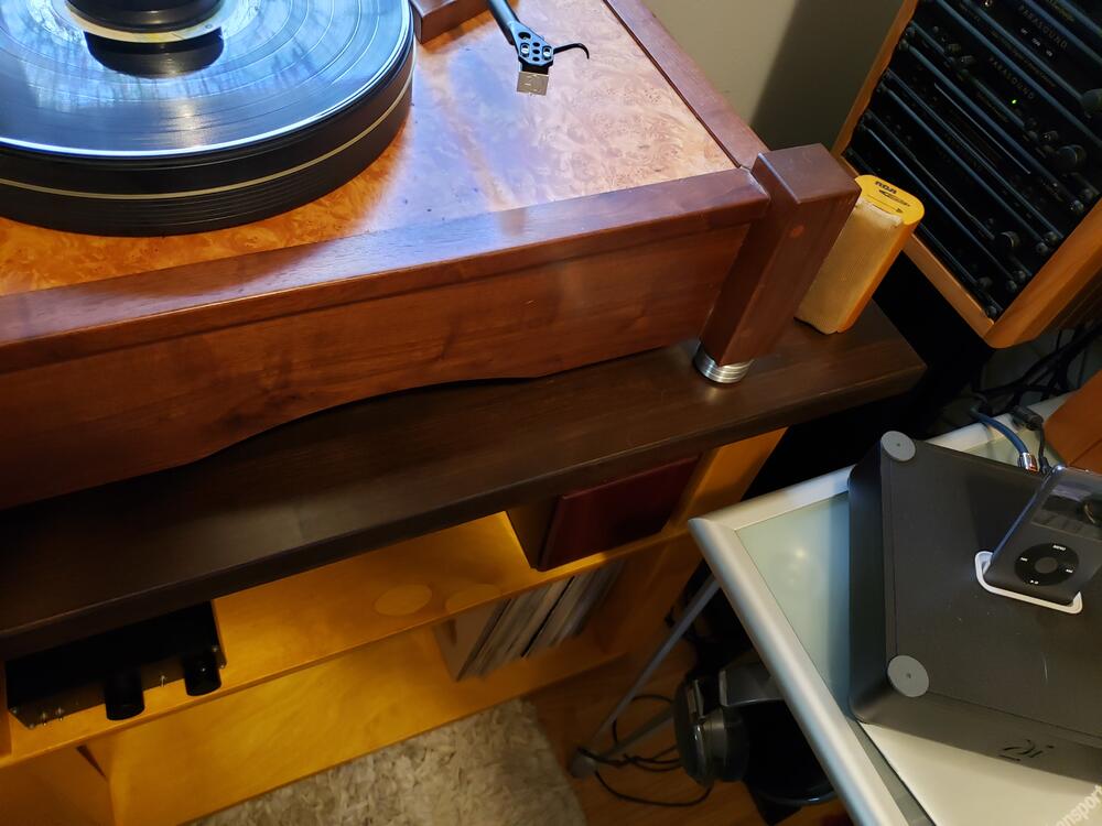 Nice job Marc! I'm now done with my latest project. Building two turntable stands back to back, I learned a few things. One, was that I'd like a second shelf above the record storage shelf, accomplished. Two, is that I'd like some kind of stop to keep the records from pushing in too far on the shelf, accomplished. I used Amber shellac on the base to try to get that golden tone of the Burled Maple top of the Colossus. Worked well, and it also provides a complimentary warm tone next to the Cherry of the Parasound tower and speakers. I also like the dark top with the Colossus.