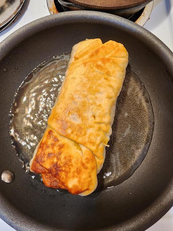 We had a long time employee in the stock room leaving today, so they made a big spread to send him off. Lots of great food, including pork burritos. I didn't want to have a filling burrito for lunch, so I set one aside in the fridge and am turning it into a chimichanga tonight. I had some homemade guacamole in the fridge for topping.