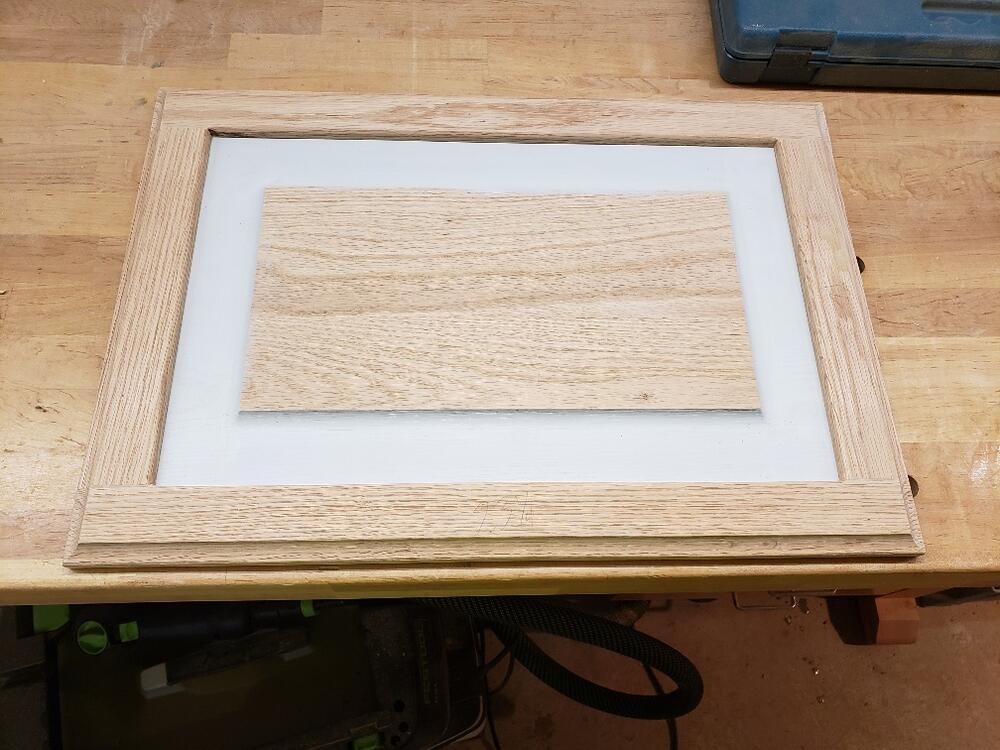 When I build raised panel doors that are going to be painted (by the customer), I like to paint the edges of the panels before securing them in the frame. Otherwise when those panels shrink up a little bit in winter, you'll see some tiny edges of bare wood. This way the panels can expand and contract inside the frames without that happening. But it's all one solid oak panel.