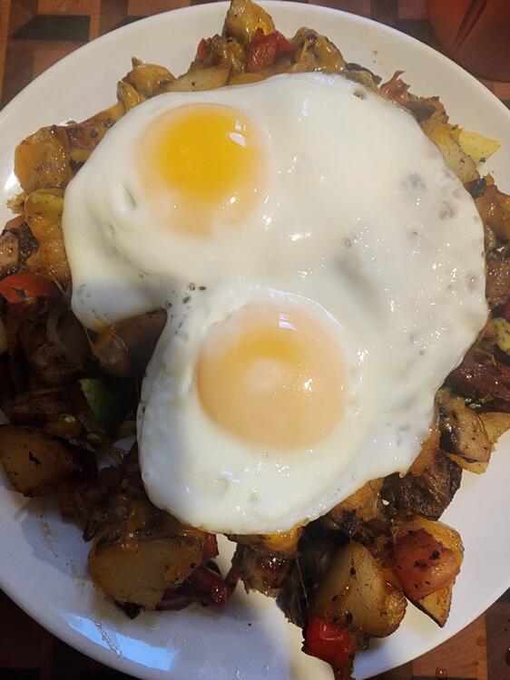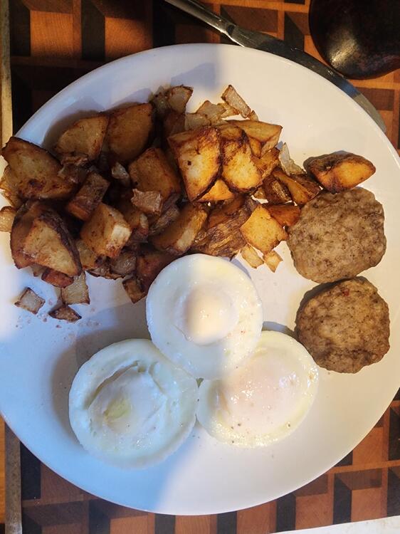 20. Earlier I made poached eggs, home fries w/onions, sausage and toast. I have silicone cups for poaching eggs that work very well.