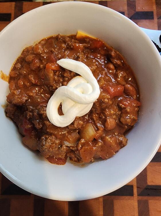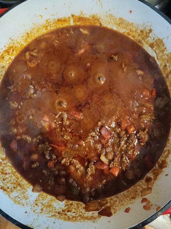 17. Made a small batch of chili in my 8 qt. enamled dutch oven. Just a Texan sized batch, as apposed to an Alaskan sized batch, which would of course be well over twice the size. 😉 Texan's be damned I like beans in my chili! But being the offspring of Texan parents, there are Fritos and cheese under the chili in my bowl. And I like a dollop of sour cream.