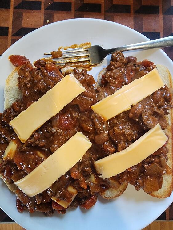 6. I still have a lot of chili left, so... I'm normally not a big fan of American cheese, but for chili and grilled cheese sandwiches, it's so melty.